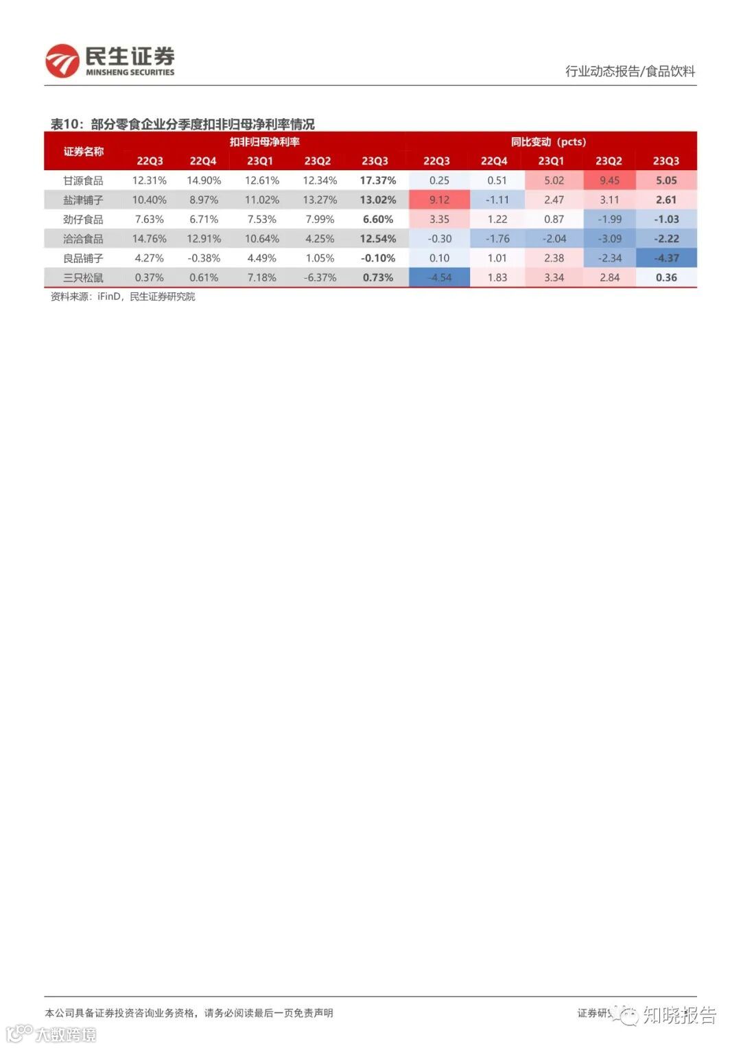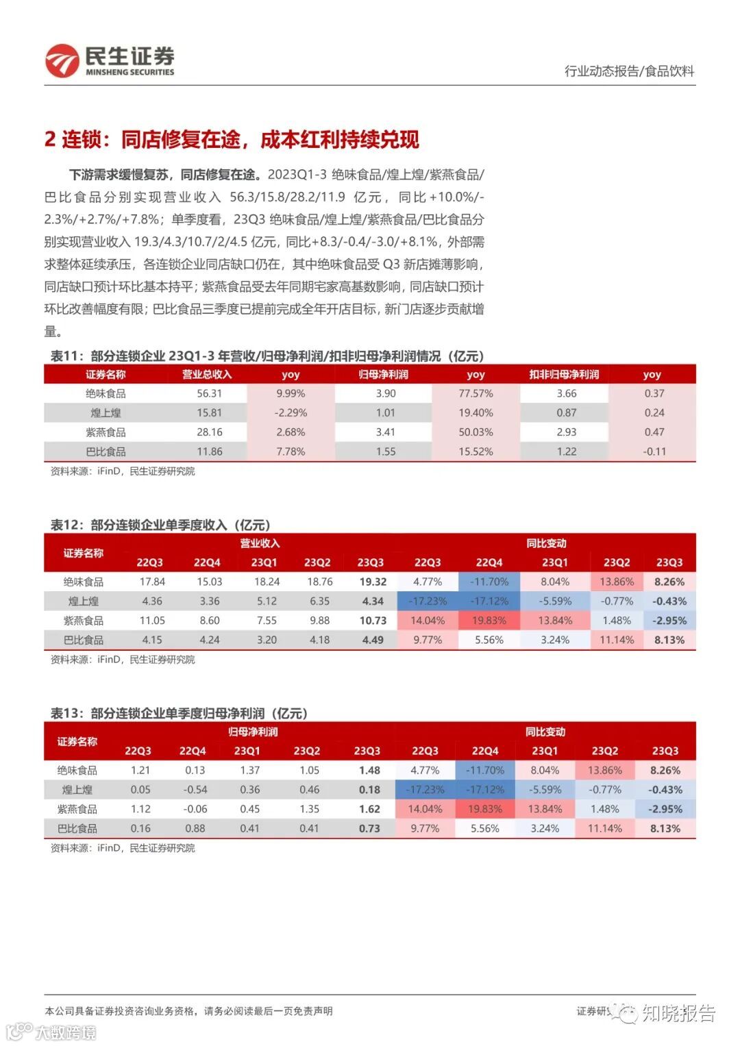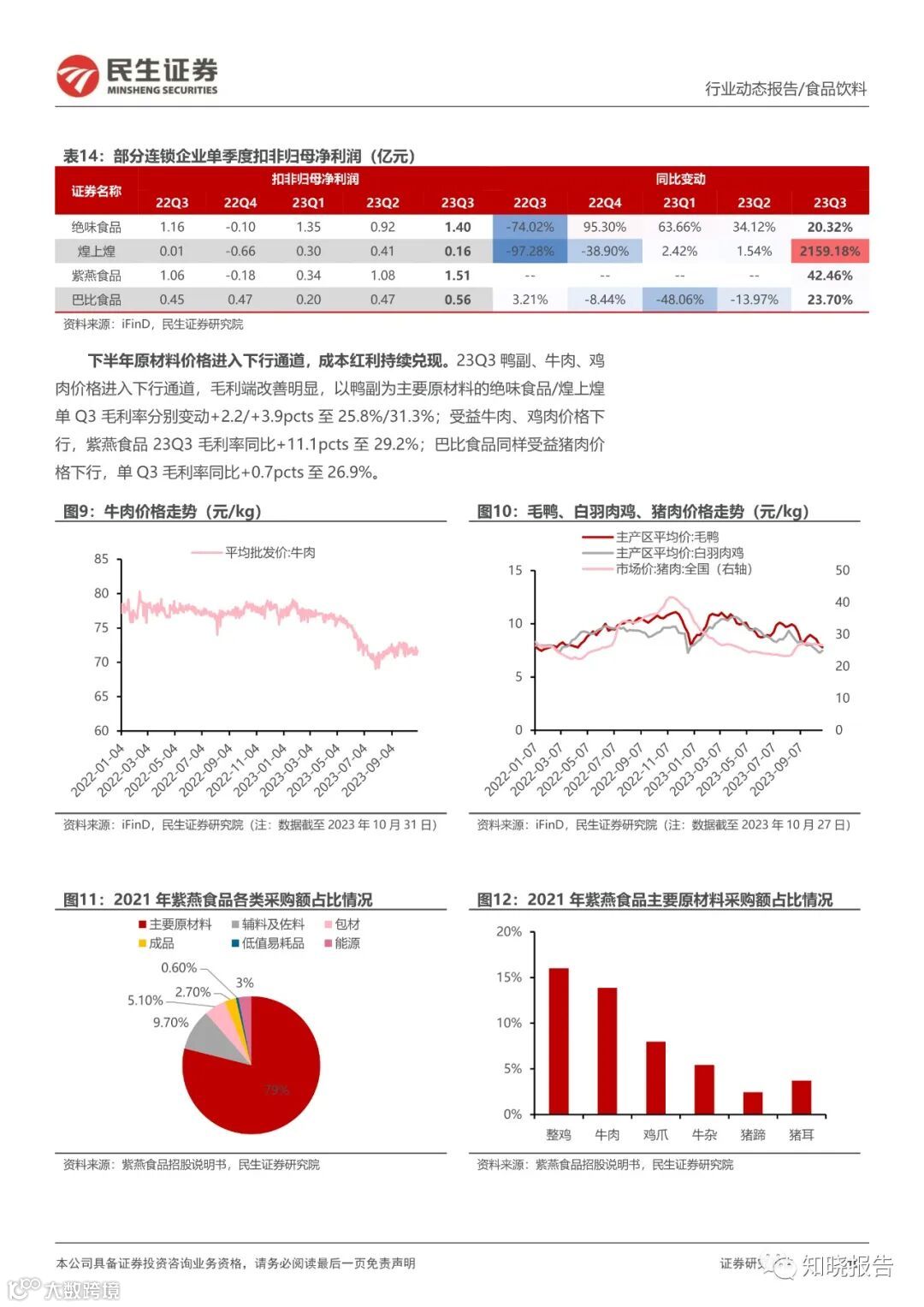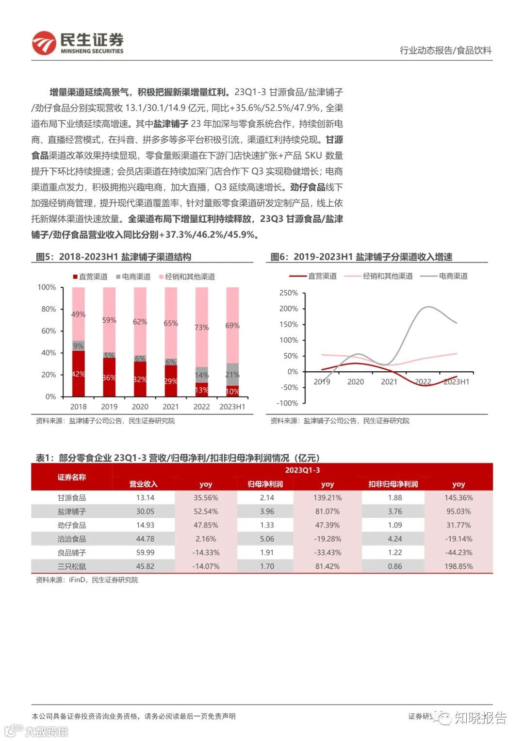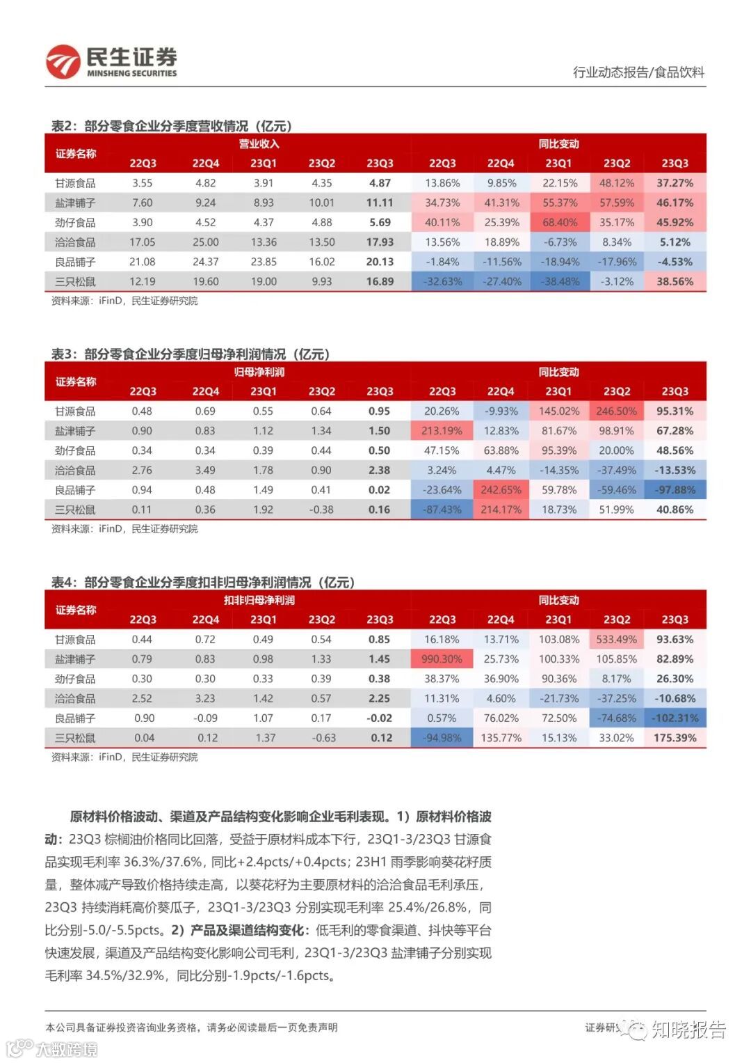积极拥抱量贩零食等新渠的制造型企业 23Q3 收入高增延续。劲仔食品 Q3 鹌鹑蛋表现持续亮眼,多品类&全渠道业绩高增;盐津铺子新品在全渠道合力推动下持续高速增长,BC 超/定量流通/兴趣电商渠道表现亮眼。