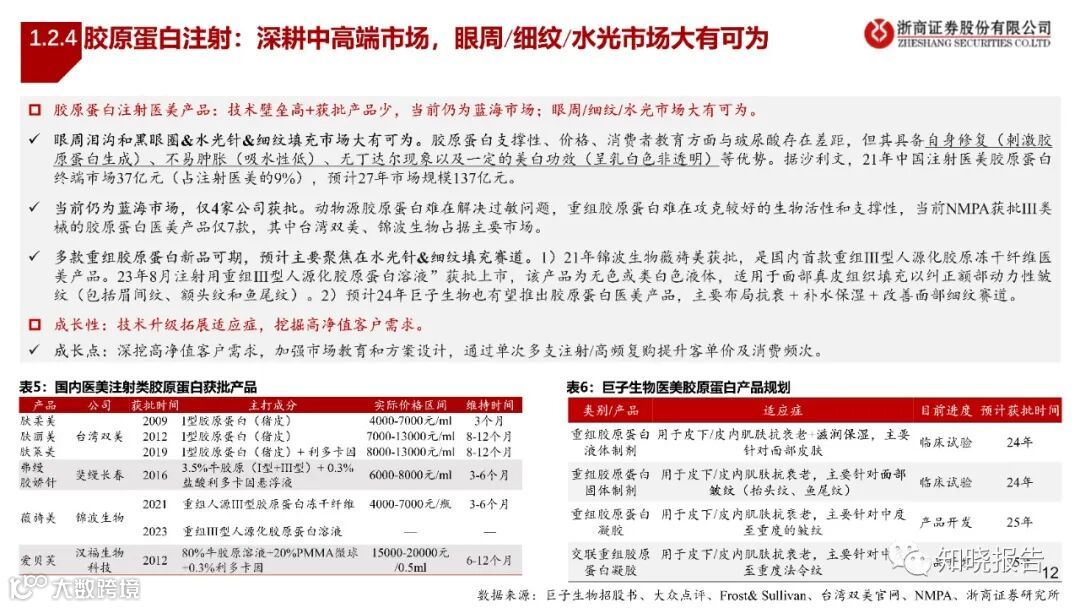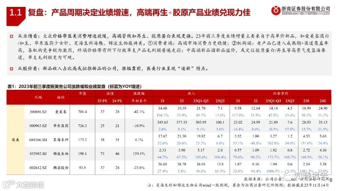 大众价格带医美消费增速放缓,高端管线如再生、胶原蛋白表现更强。23年前三季度业绩增量主要来自于高单价新品,如爱美客濡白/如生、华东医药少女针、昊海生科海魅、锦波生物薇旖美。