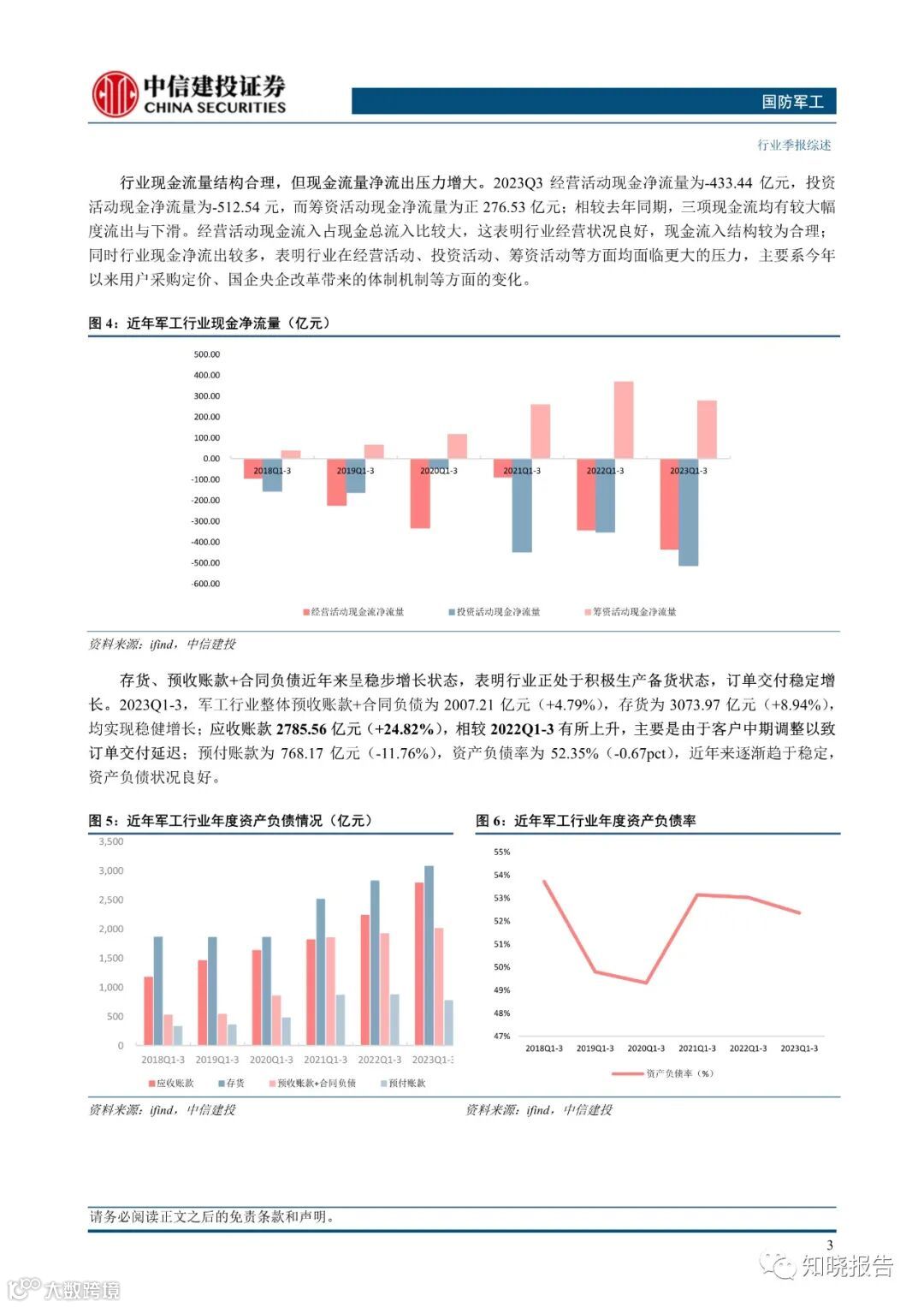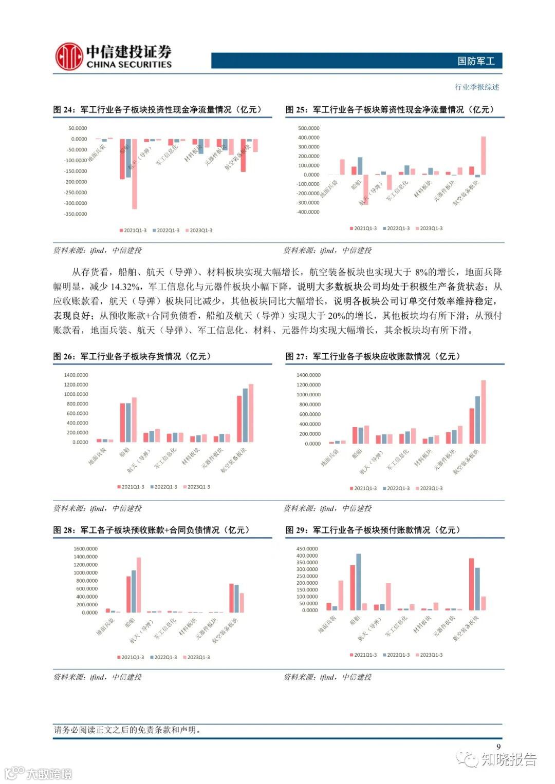 此外,91 家公司的整体毛利率为 20.42%(+0.02pct);净利率为 7.71%(-0.22pct);ROE 为 4.55%(-0.01pct)。分上下游看,营收整体稳健增长,下游盈利能力逆势增长。23Q1-3 军工主要标的业绩分化明显,航发船舶板块维持增速。