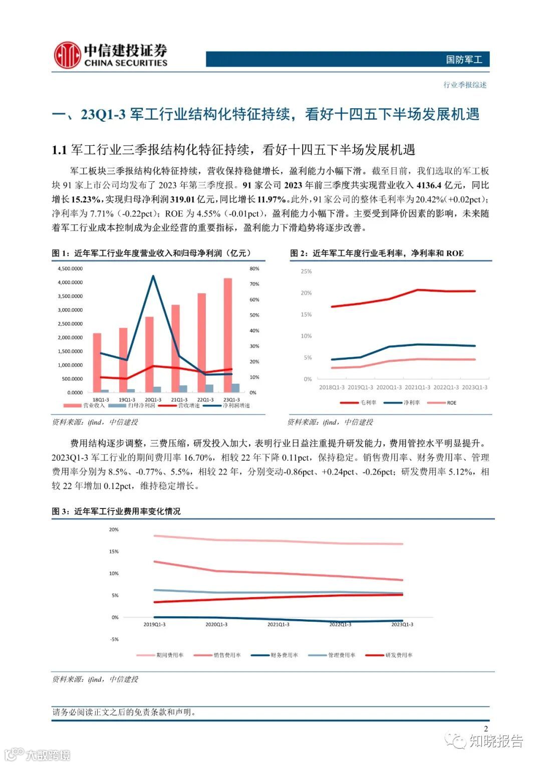 军工板块三季报结构化特征持续,营收保持稳健增长,盈利能力小幅下滑。我们选取的军工板块 91 家上市公司均发布了 2023 年第三季度报。91 家公司 2023 年前三季度共实现营业收入 4136.4 亿元,同比增长 15.23%,实现归母净利润 319.01 亿元,同比增长 11.97%。