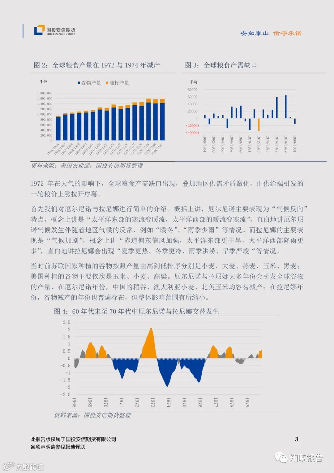 趋势上来看,20 世纪 70 年代粮食(谷物与油籽的统称)产量保持整体增长趋势,只在 1972年与 1974 年经历了两次减产,分别减产 1%与 4%。同时期全球粮食的需求保持更为稳步和快速的增长,使得产需缺口(当年产量与需求量之差为负数)偶有出现。