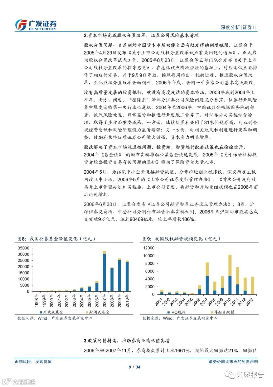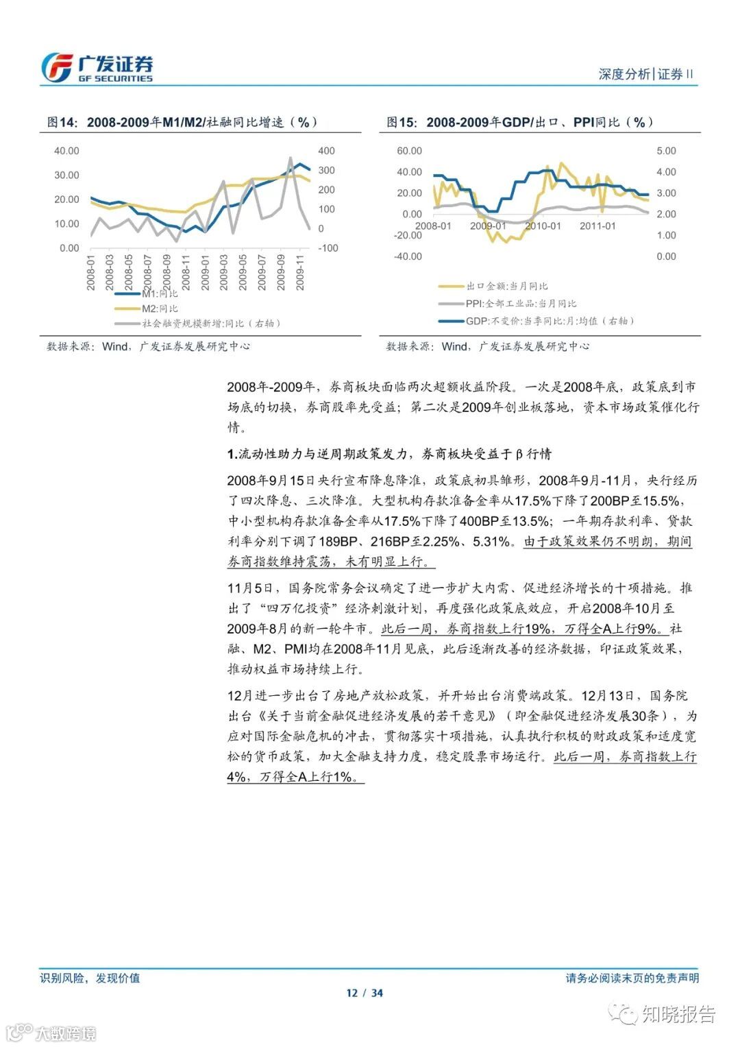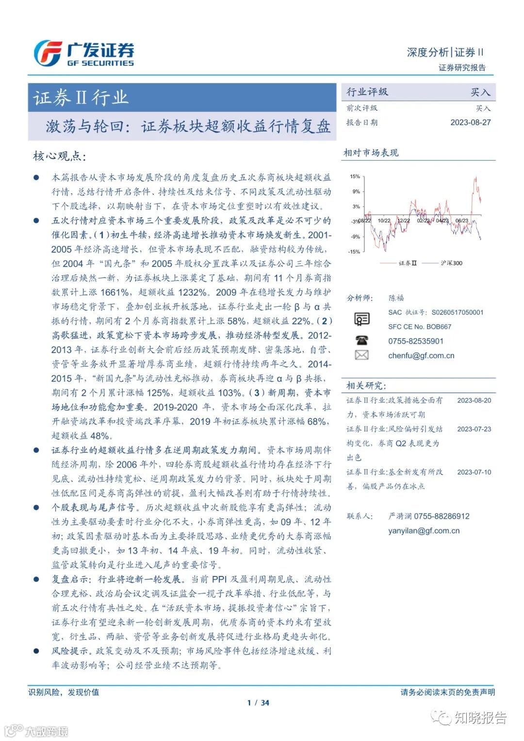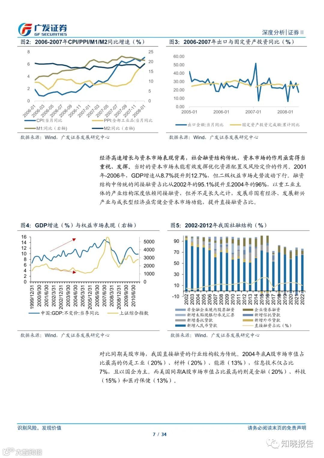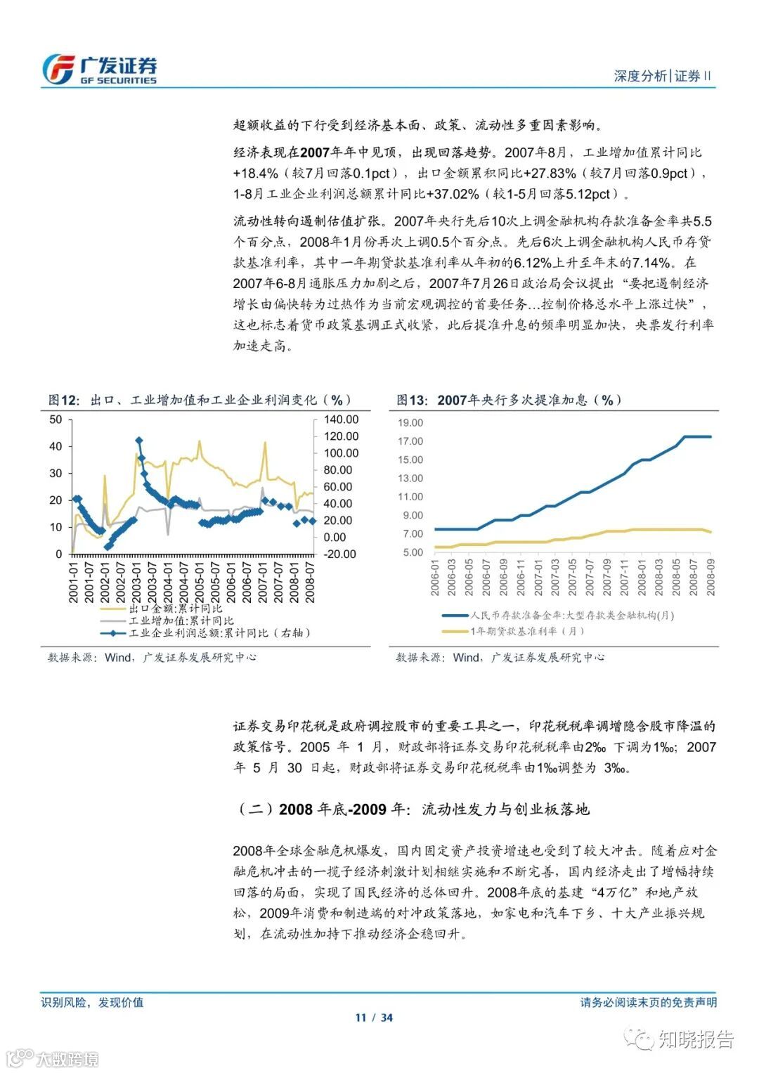 (1)初生牛犊,经济高速增长推动资本市场焕发新生。2001-2005 年经济高速增长,但资本市场表现不匹配,融资结构较为传统,但 2004 年“国九条”和 2005 年股权分置改革以及证券公司三年综合治理后焕然一新,为证券板块上涨奠定了基础,期间有 11 个月券商指数累计上涨 1661%,超额收益 1232%。2009 年在稳增长发力与维护市场稳定背景下,叠加创业板开板落地,证券行业走出一轮 β 与 α 共振的行情,期间有 2 个月券商指数累计上涨 58%,超额收益 22%。