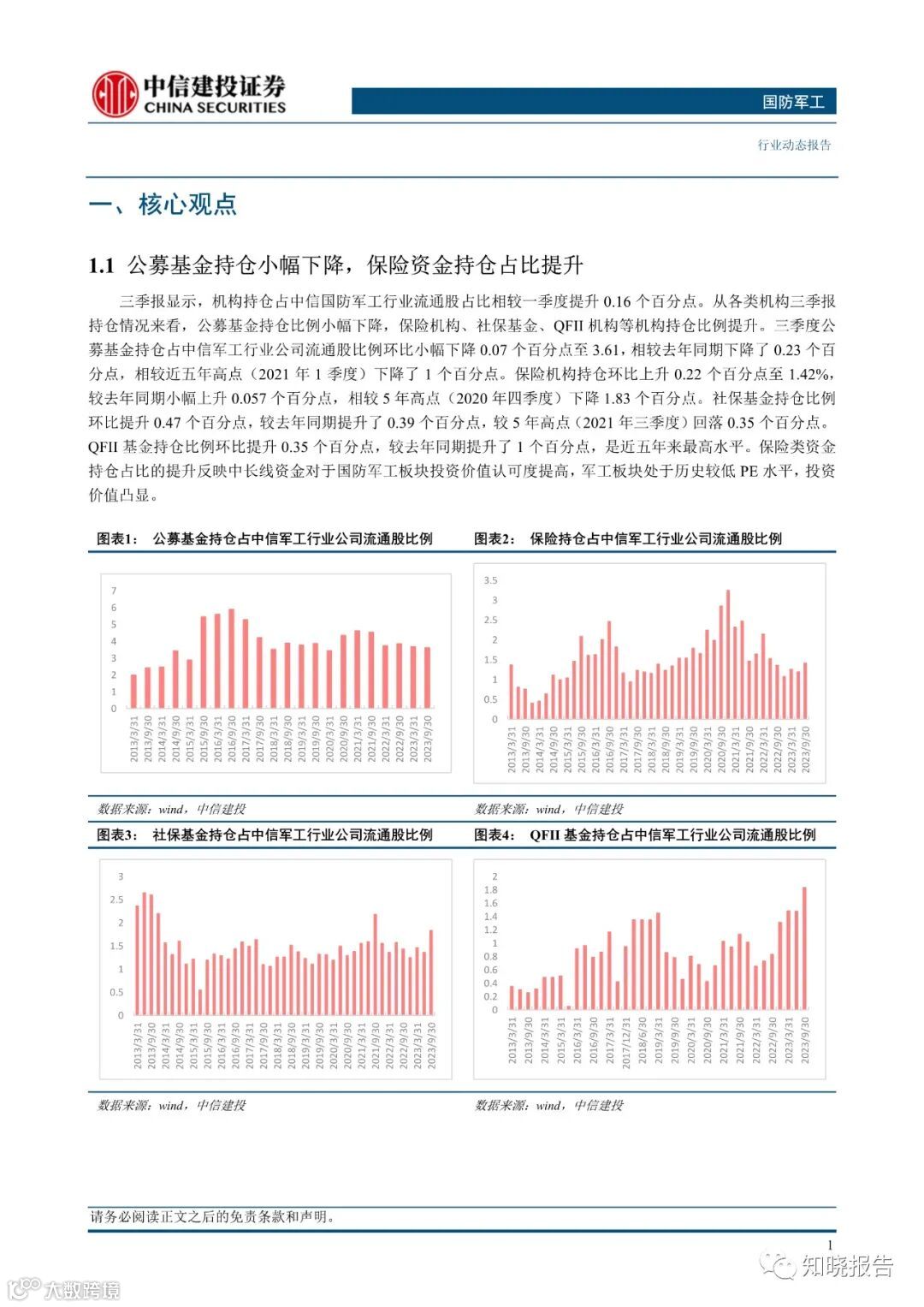 三季报显示,机构持仓占中信国防军工行业流通股占比相较一季度提升0.16 个百分点。从各类机构三季报持仓情况来看,公募基金持仓比例小幅下降,保险机构、社保基金、QFII 机构等机构持仓比例提升。