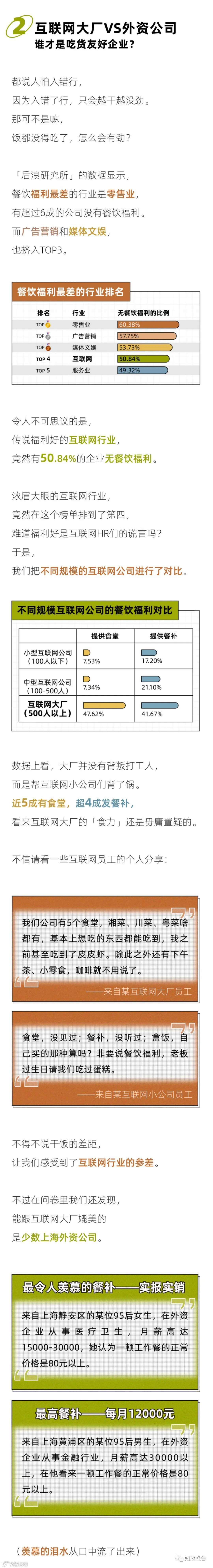 数据显示,餐饮福利最差的行业是零售业,有超过6成的公司没有餐饮福利。而广告营销和媒体文娱,也挤入TOP3。令人不可思议的是,传说福利好的互联网行业,竟然有50.84%的企业无餐饮福利。浓眉大眼的互联网行业,竟然在这个榜单排到了第四,难道福利好是互联网HR们的谎言吗?于是,我们把不同规模的互联网公司进行了对比。