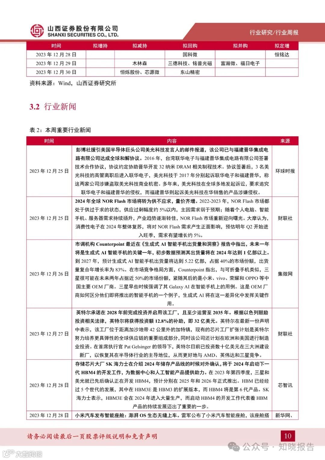 2022-2023 年,NORFlash 市场供过于求,供应过剩幅度约 5%以内;随着个人电脑、智能手机、服务器需求持续扬升,NOR Flash 市场重新迎向曙光。2024 年消费电子整体复苏,将对 NOR Flash 需求产生正面影响,预估明年 Q2 开始进入旺季。美光科技与福建晋华达成全球和解协议。