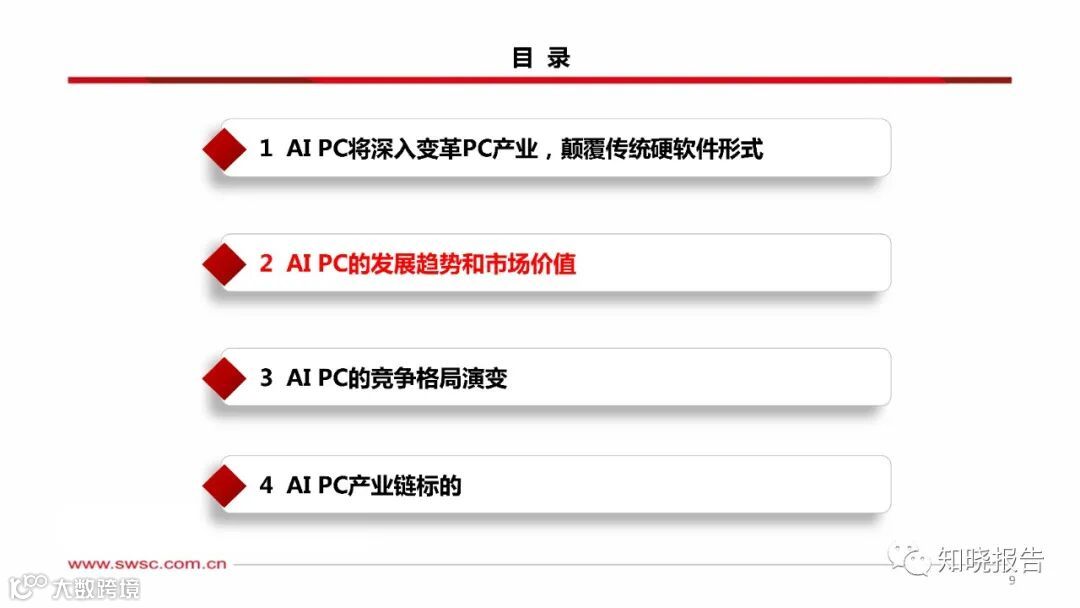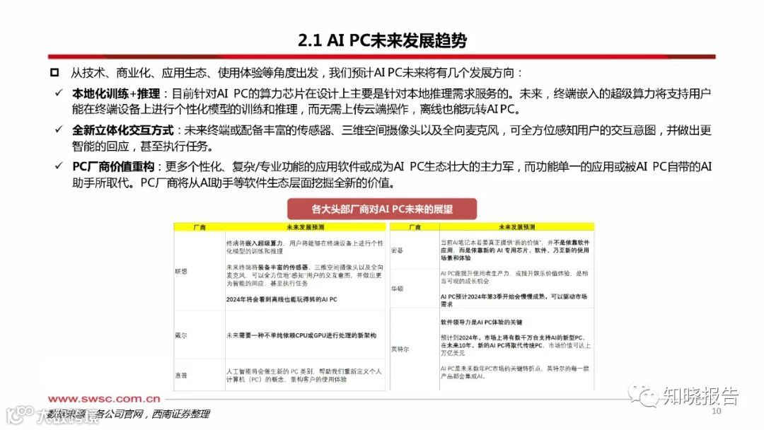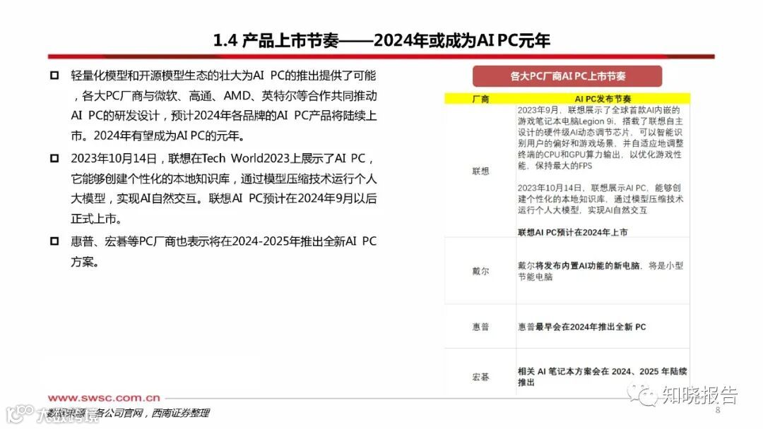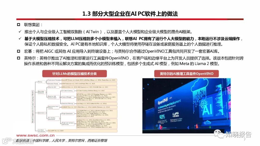 智能设备作为人工智能触达用户的载体,AI PC将深入变革PC产业。生成式A和LLM的飞跃式发展,深刻变革了个人生活与工作模式,加速各行各业智能化转型。AI发展正从软件主导转向硬件+软件并行驱动,而智能设备作为AI触达用户的终极载体,正成为AI未来发展与落地的重要突破口。