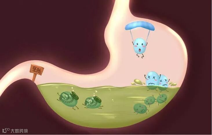益生菌借助食物进入人体,要通过强酸的胃液——通过诸多消化酶、溶菌酶分解——经历小肠的碱性环境等。