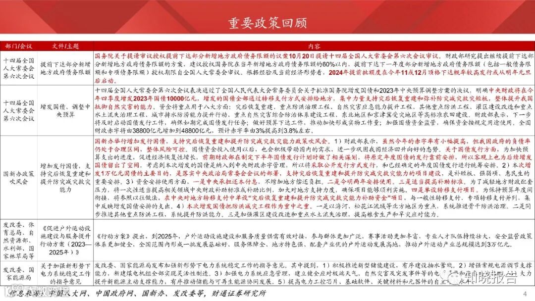 本周十四届批准了关于增发国债和调整中央预算的决议,明确上调赤字率0.8个百分点,中央加杠杆1万亿元,通过公开发行国债的方式筹集资金,以转移支付方式下达地方,支持灾后恢复重建和提升防灾减灾救灾能力。