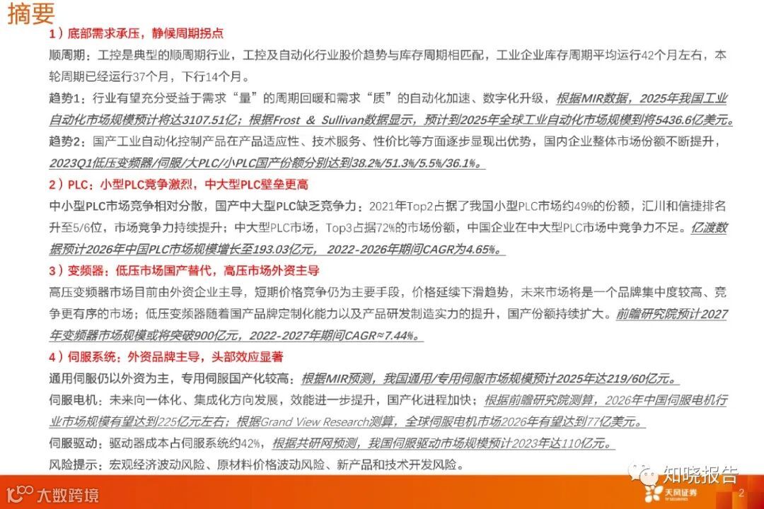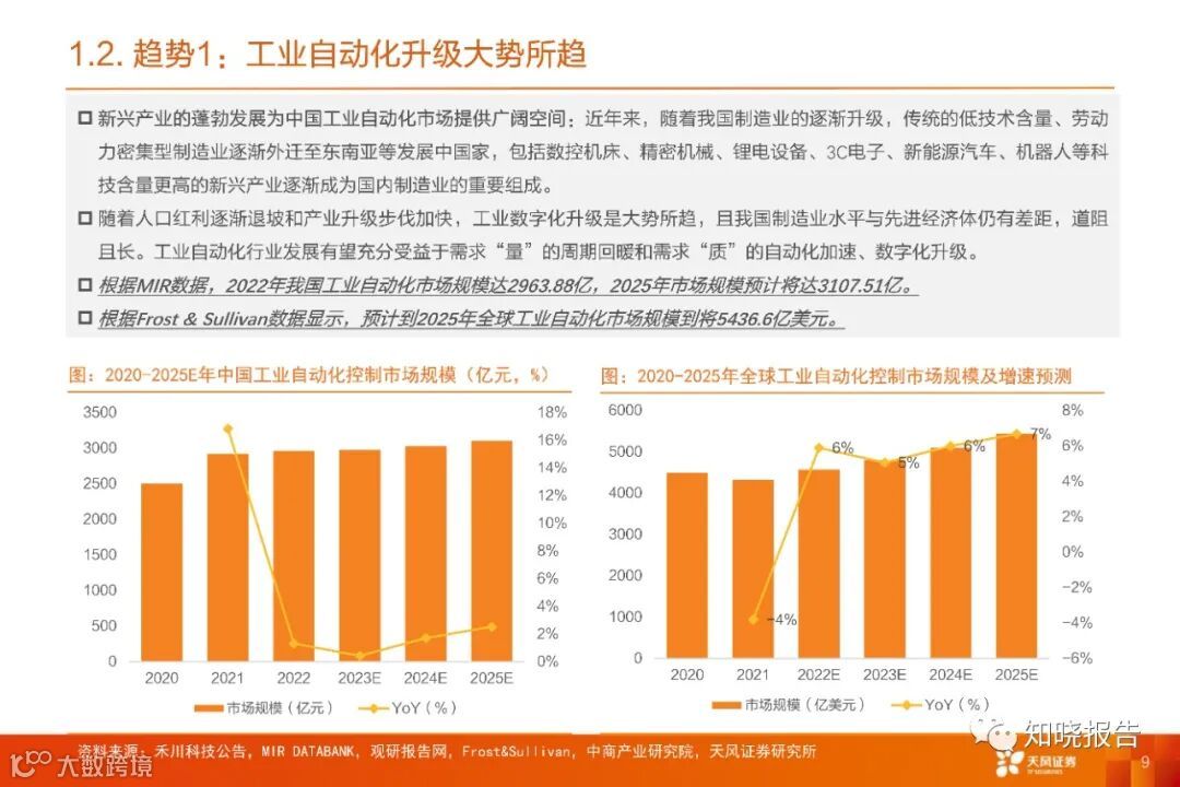趋势1:行业有望充分受益于需求“量”的周期回暖和需求“质”的自动化加速、数字化升级,根据MIR数据,2025年我国工业自动化市场规模预计将达3107.51亿;根据Frost & Sullivan数据显示,预计到2025年全球工业自动化市场规模到将5436.6亿美元。