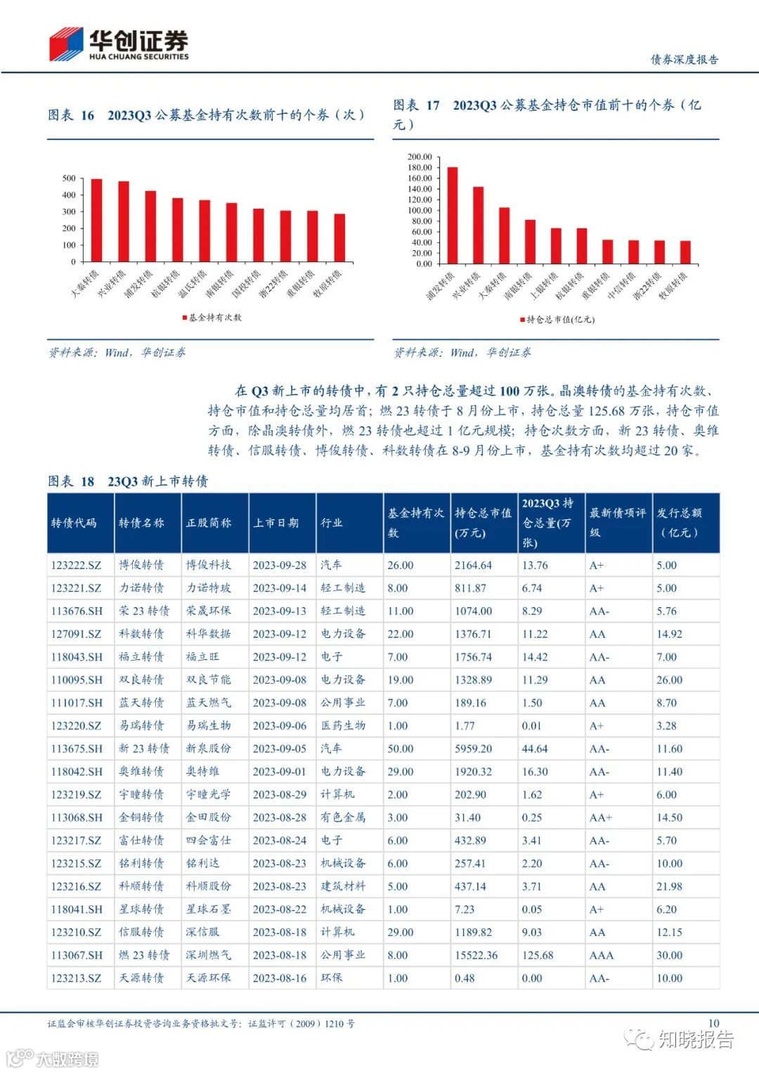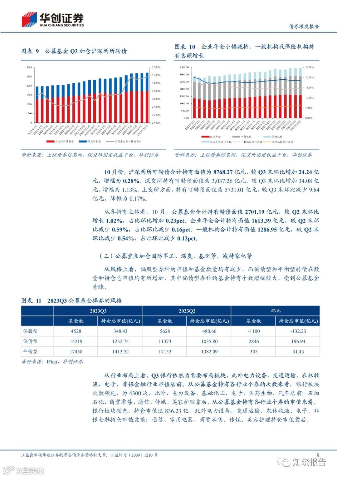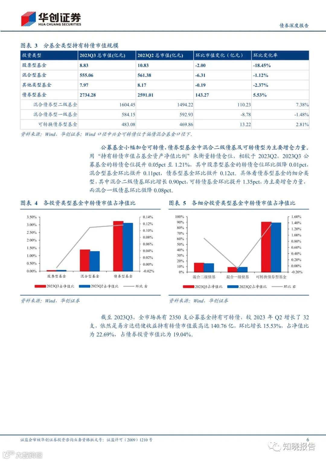 相较于 2023Q2,2023Q3 公募基金的转债仓位提升 0.05pct 至 1.21%,其中股票型基金的转债仓位环比微降 0.01pct,混合型基金环比微升 0.11pct,债券型基金环比微升 0.12ct。具体看债券型基金的细分类型,其中混合二级债基环比增长 0.90pct,可转债基金环比提升 1.35pct,为主要增仓力量,而混合一级债基环比微降 0.08pct。