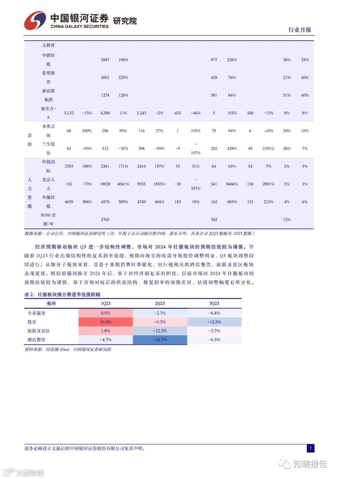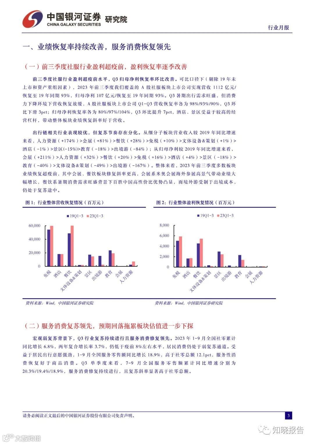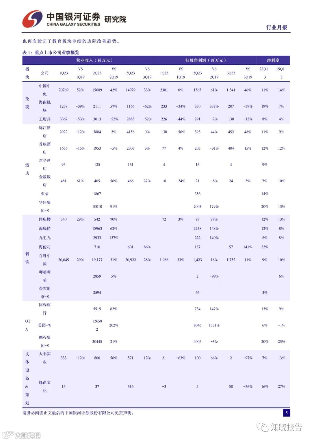 前三季度社服行业盈利超疫前,盈利恢复率持续改善。可比口径下(剔除 19 年未上市和资产重组因素),2023 年前三季度我们覆盖的 A 股社服板块上市公司实现营收 1112 亿元/恢复至 19 年同期 93%,归母净利 107 亿元/恢复至 19 年同期 93%。