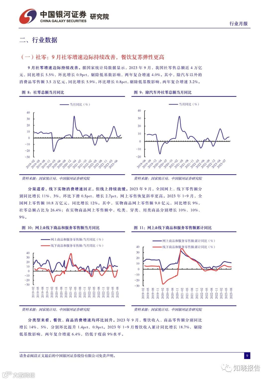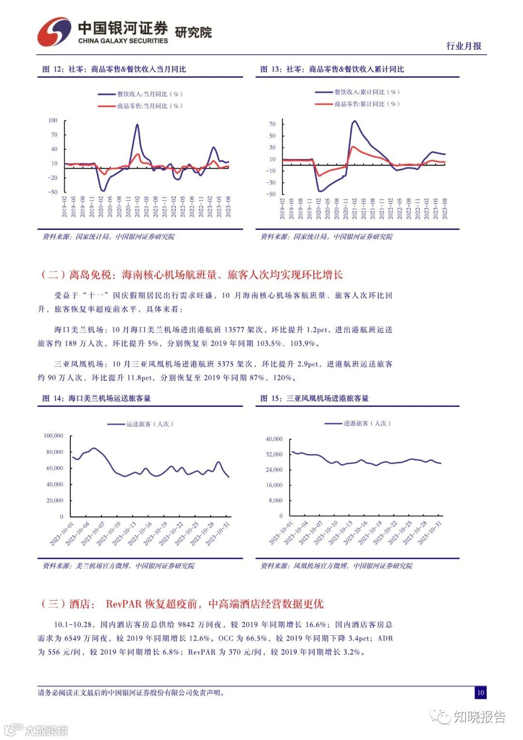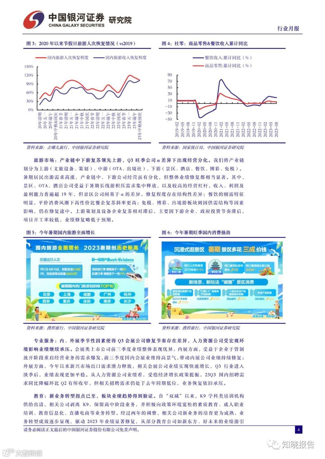 前三季度社服行业盈利超疫前,盈利恢复率持续改善。可比口径下(剔除 19 年未上市和资产重组因素),2023 年前三季度我们覆盖的 A 股社服板块上市公司实现营收 1112 亿元/恢复至 19 年同期 93%,归母净利 107 亿元/恢复至 19 年同期 93%。