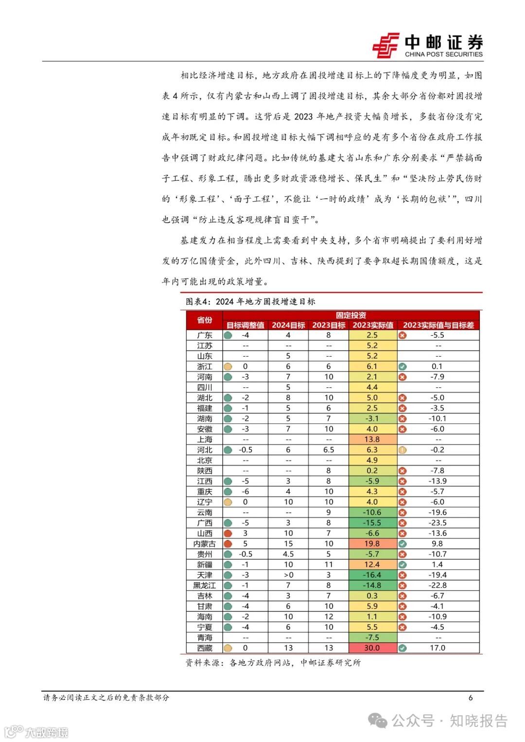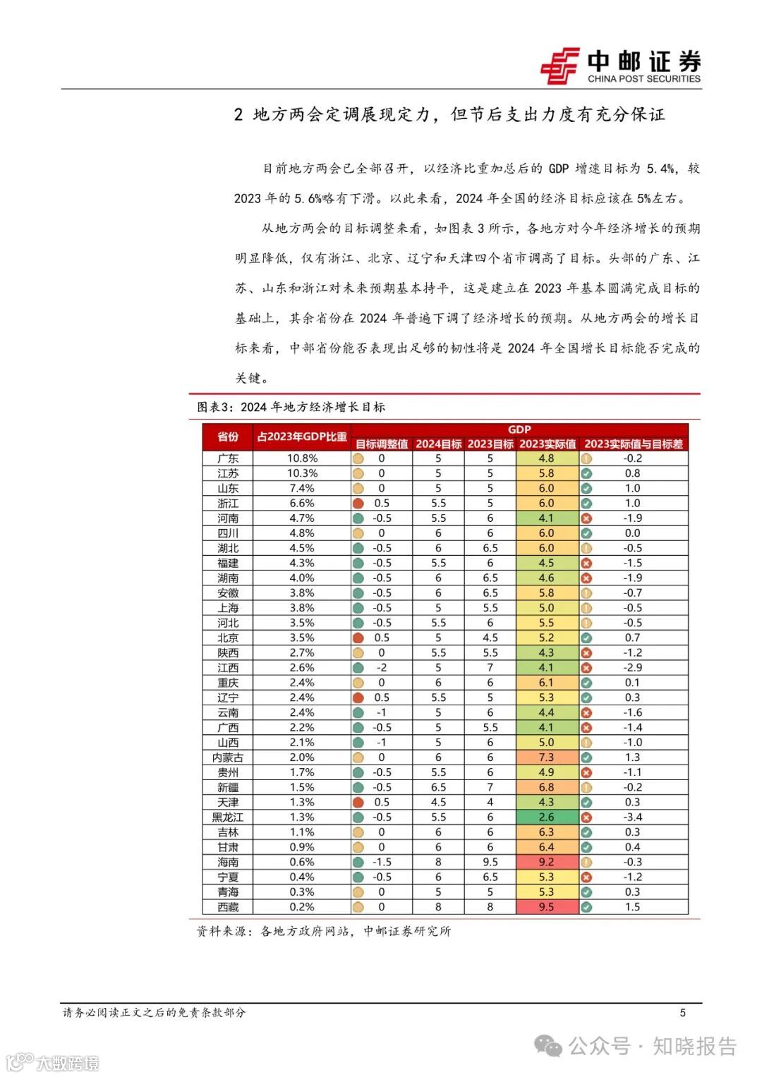 微观流动性层面,ETF 资金带动中证 1000 和中证 2000 等小盘指数大幅反弹,已经在相当程度上缓释了融资盘的平仓风险,融资盘再次出现集中平仓的可能性较低。政策层面,目前地方两会已全部召开,以经济比重加总后的 GDP增速目标为 5.4%,较 2023 年的 5.6%略有下滑。