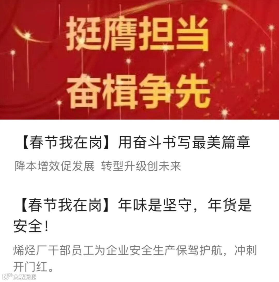 该厂各单位在利用交接班会传达讲话要求的同时,积极转发学习《集团公司董事长、党组书记戴厚良除夕视频连线慰问公司全体干部员工》《戴厚良董事长慰问抚顺石化 员工感言传递责任与担当》《抚顺石化迅速传达贯彻戴厚良董事长除夕视频连线工作要求保安全保供给》等公众号消息,在员工中引起强烈反响。“赓续红色血脉 实干开创未来!”“我们会高质量完成各项任务,决胜2025年大检修!”员工纷纷留言评论,传递着满满的干劲和力量。