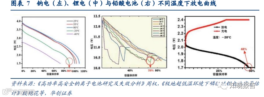 低温性能超磷酸铁锂电池和铅酸电池,在-20℃的温度下,钠离子电池的容量保持率高达 90%,而磷酸铁锂电池和铅酸电池仅能达到 70%和 48%。