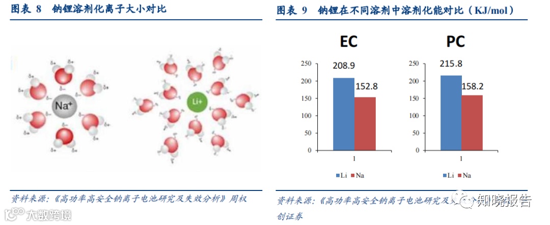 相较锂离子,钠离子的斯托克斯直径更小且在极性溶剂中溶剂化能更低,使得钠离子电 池电解液具有更高电导率。斯托克斯直径是指在同一流体中与颗粒的密度和沉降速度相 等的圆球的直径,直径越小,离子移动速度越快,其所在电解液导电率越高。溶剂化能 是离子在电极表面脱离溶剂分子的能垒,较低的溶剂化能使得钠离子在电极表面更容易 脱去溶剂分子,界面离子扩散能力更佳,离子在电解液中具有更快的动力学性质,从而 使得电解液具有更高电导率。