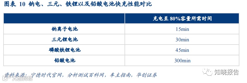 优秀的电解液电导率使得钠离子电池具有出众的倍率性能。宁德时代的第一代钠离子电 池在常温下充电 15 分钟即可达到 80%的电量,中科海钠制造的钠离子电池能够在 12min 充电至 90%,充电速度高于锂离子电池和铅酸电池。