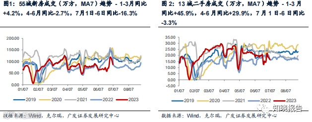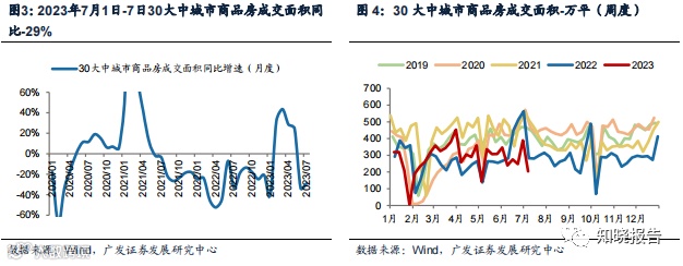地产高频数据显示地产销售端弱复苏,投资端仍在筑底。据Wind、克尔瑞和广发地 产小组,55城新房成交(万方,MA7)1-3月同比+4.2%,4-6月同比-2.7%,7月1日 -6日同比-16.3%;13城二手房成交(万方,MA7)1-3月同比+45.9%,4-6月同比 +29.9%,7月1日-6日同比-3.3%。Wind统计30大中城市商品房成交面积,1-3月同比 +5.6%,4月同比+28.4%,5月同比+24%,6月同比-33%,7月1日-7日同比-29%。据国家统计局,2023年1-5月房地产开发投资/新开工面积/销售面积/施工面积/竣工 面积增速分别为-7.2%/-22.6%/-0.9%/-6.2%/+19.6%。