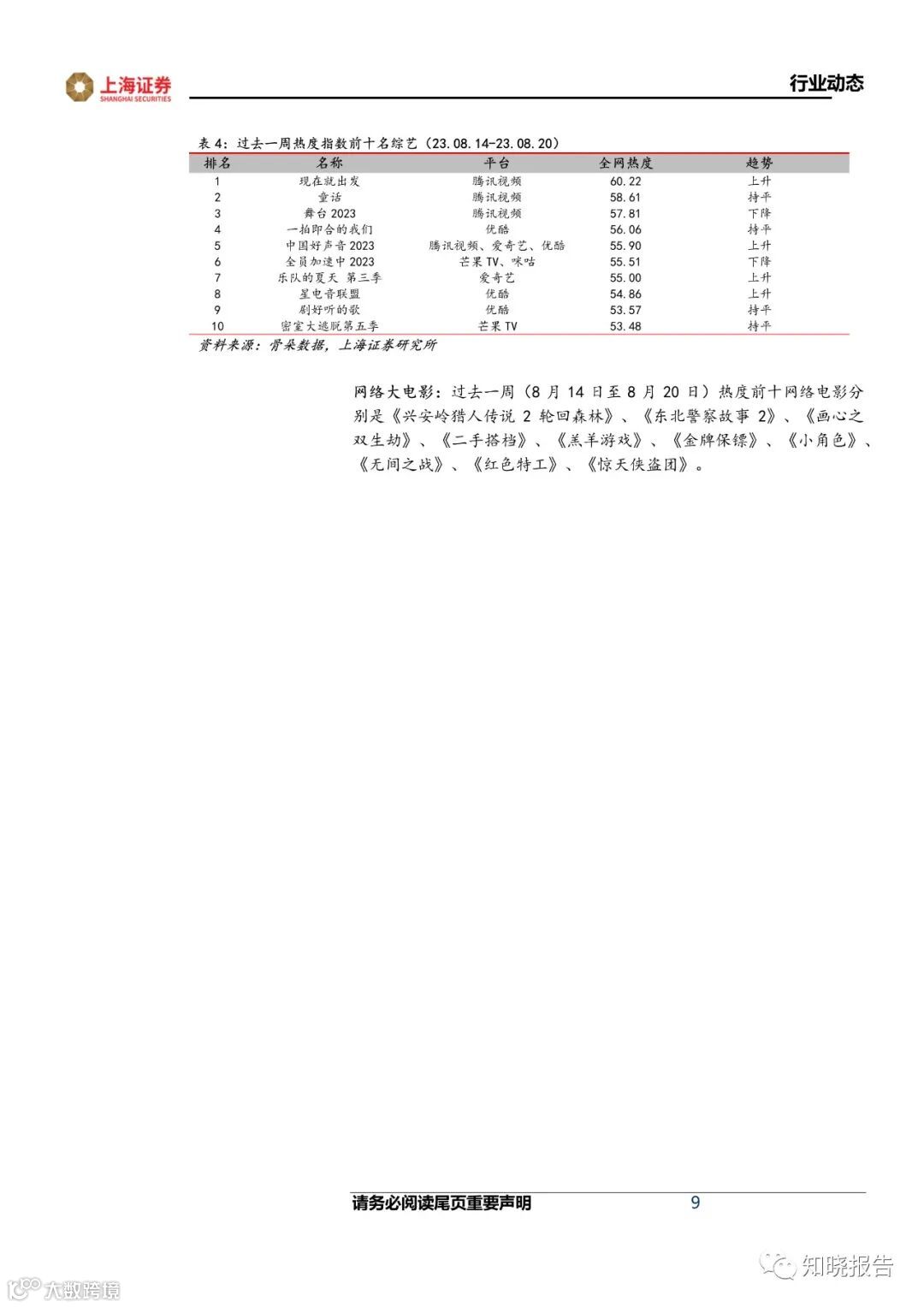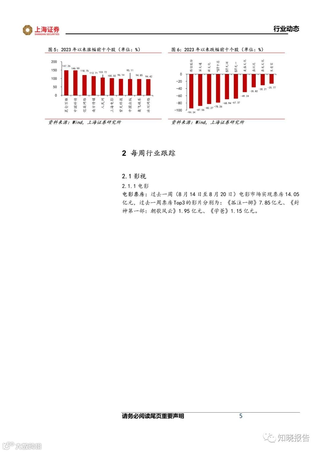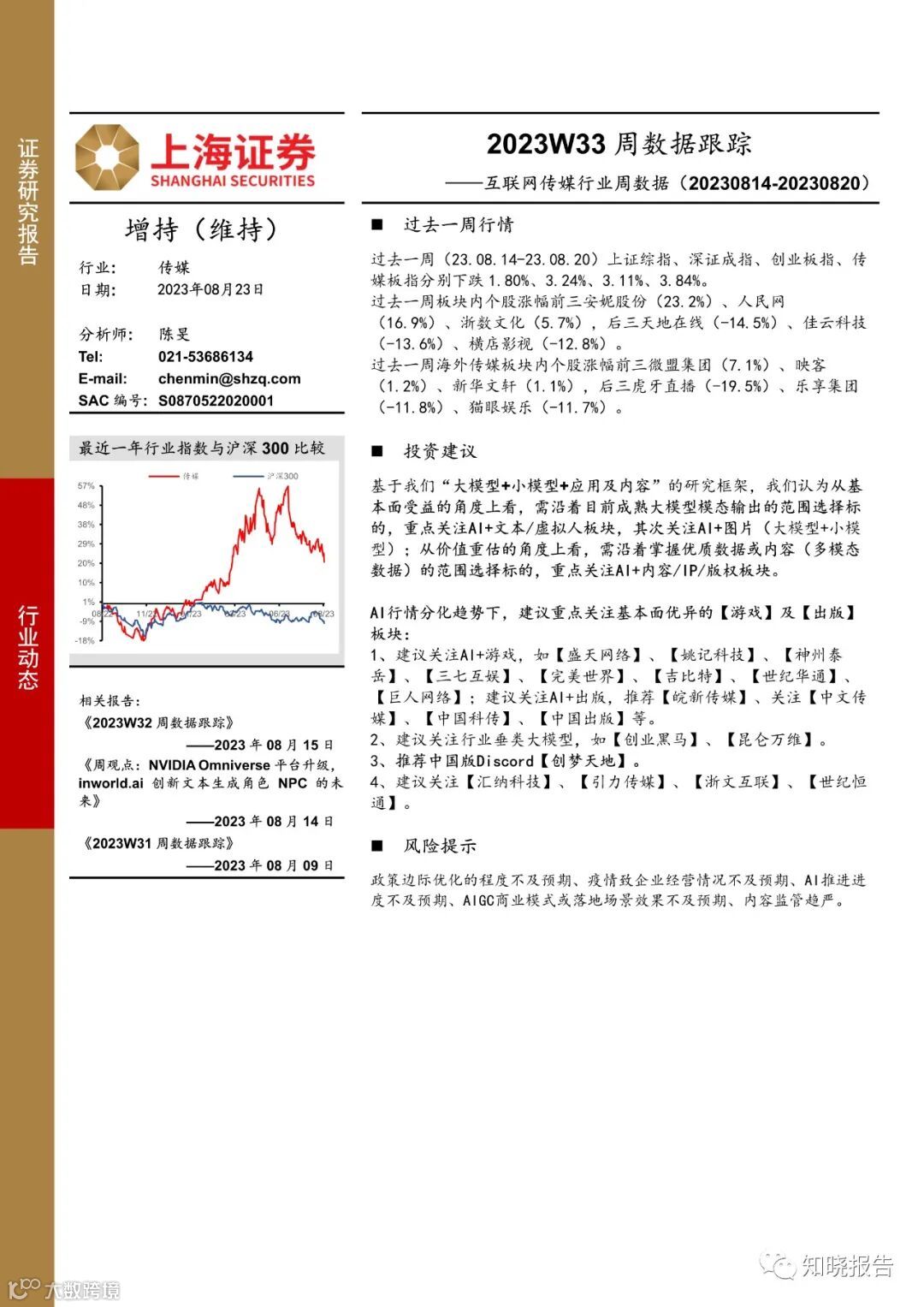 过去一周(23.08.14-23.08.20)上证综指、深证成指、创业板指、传媒板指分别下跌1.80%、3.24%、3.11%、3.84%。过去一周板块内个股涨幅前三安妮股份(23.2%)、人民网(16.9%)、浙数文化(5.7%),后三天地在线(-14.5%)、佳云科技(-13.6%)、横店影视(-12.8%)。