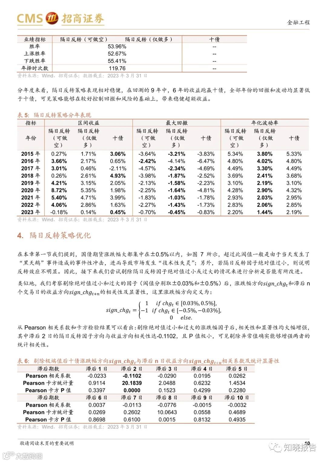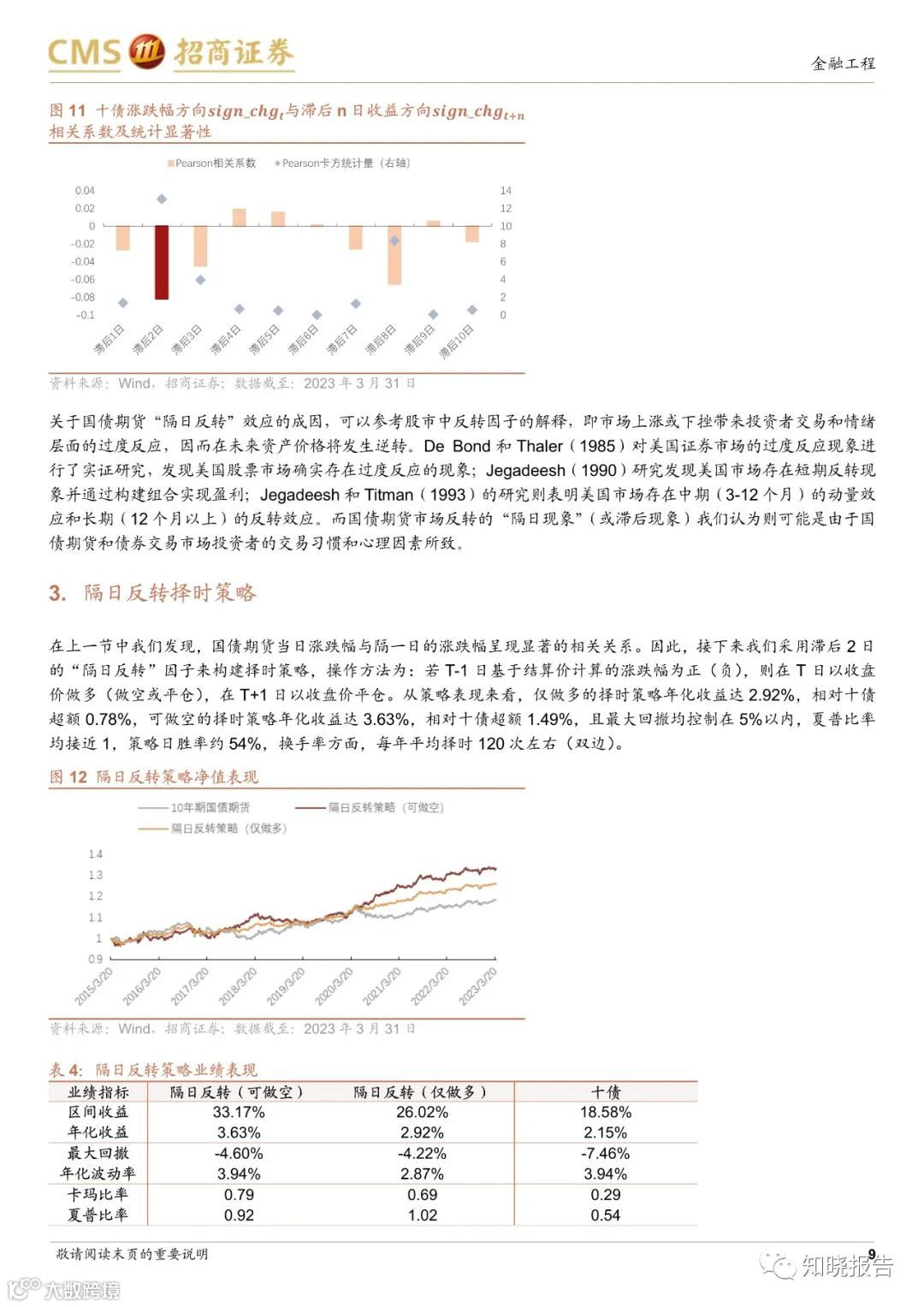 本文首先分析了国债期货的量价特征,以10只国债为例,通过相关性和显着性检验实验证明,国债期货具有很强的“次日反转”效应,并据此构建择时策略,它取得了很好的效果。多头和空头策略均跑赢十债,回撤低位。比例接近于1。去除一些绝对值过小和过大的“极端”因子值后,改进后的选择当策略效果得到明显提升时,回撤明显提升,夏普比率提升至1.4左右。中奖率上升至约54%。