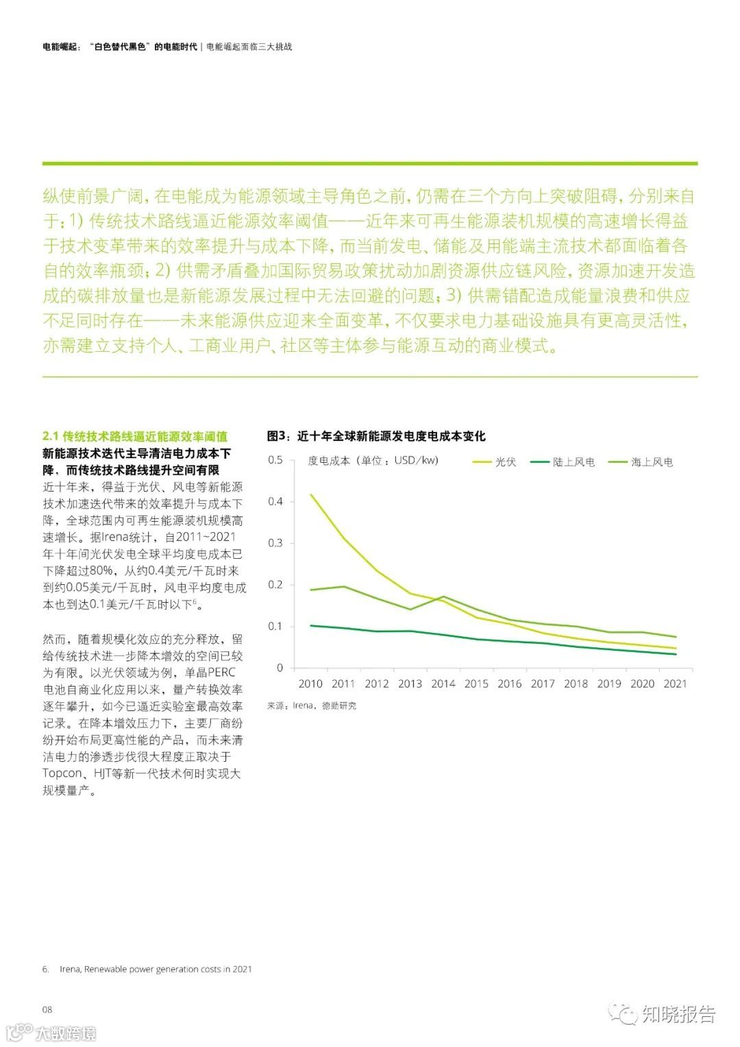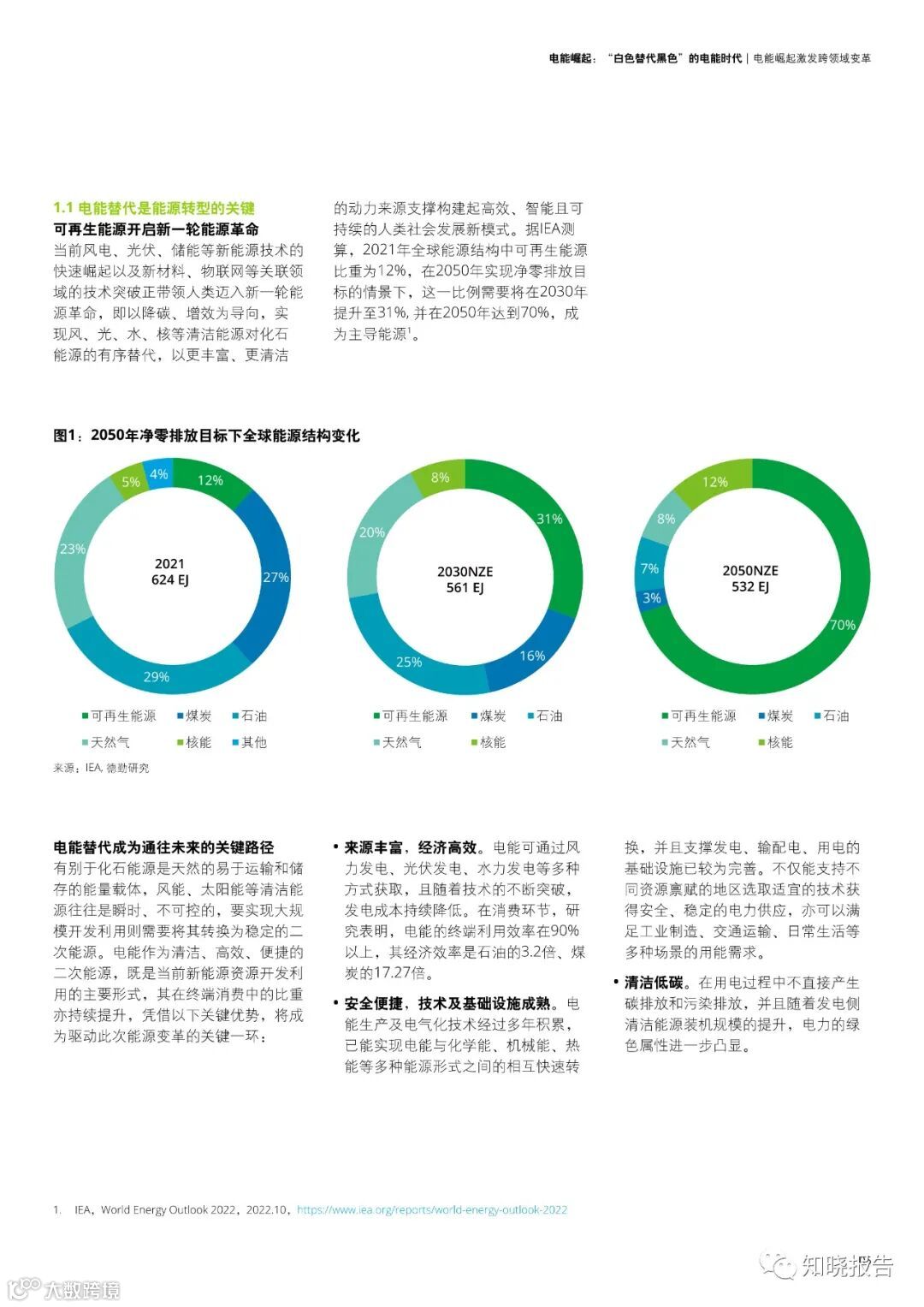 可再生能源开启新一轮能源革命当前风电、光伏、储能等新能源技术的快速崛起以及新材料、物联网等关联领域的技术突破正带领人类迈入新一轮能源革命,即以降碳、增效为导向,实现风、光、水、核等清洁能源对化石能源的有序替代,以更丰富、更清洁的动力来源支撑构建起高效、智能且可持续的人类社会发展新模式。据IEA测算,2021年全球能源结构中可再生能源比重为12%,在2050年实现净零排放目标的情景下,这一比例需要将在2030年提升至31%, 并在2050年达到70%,成为主导能源。