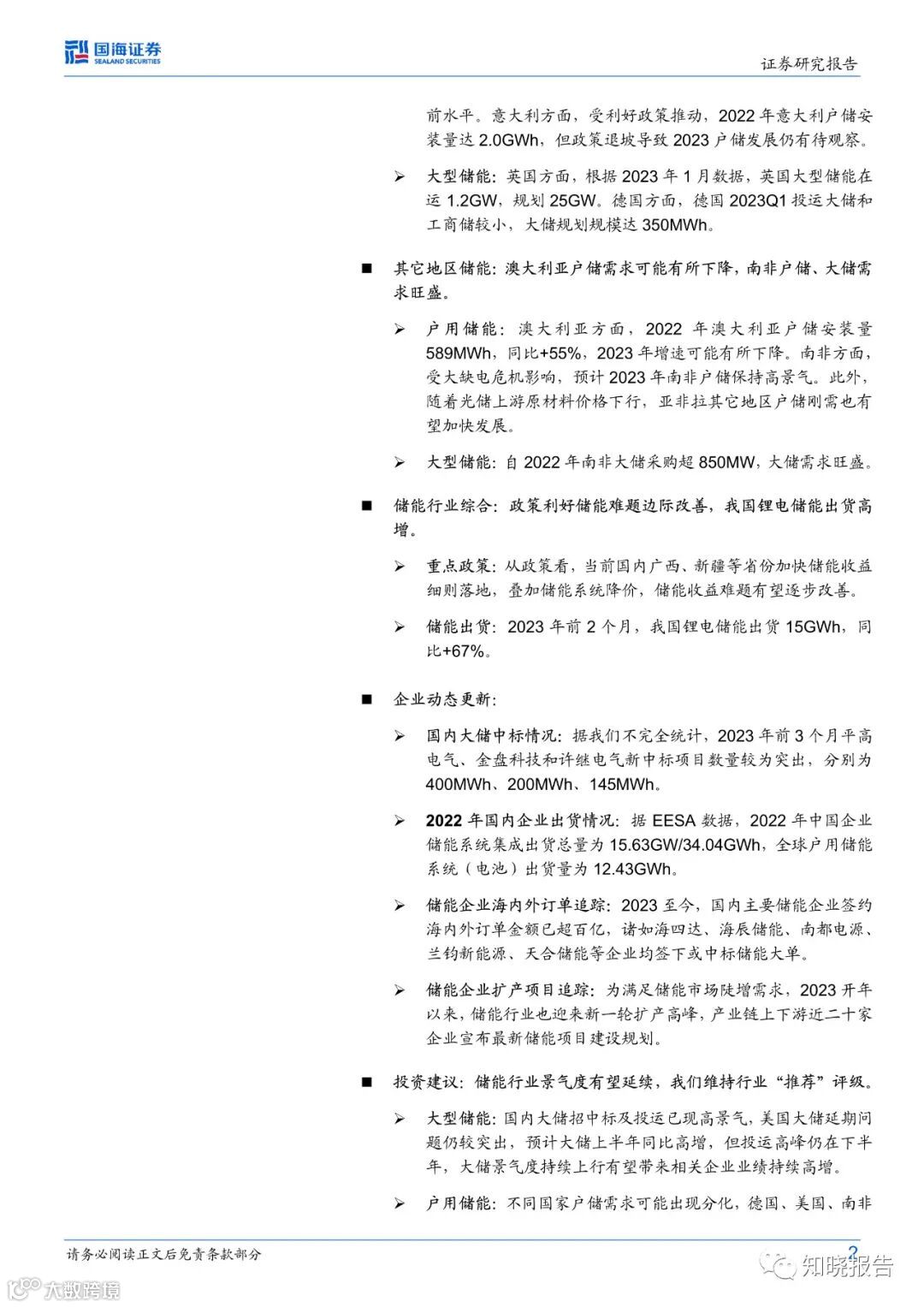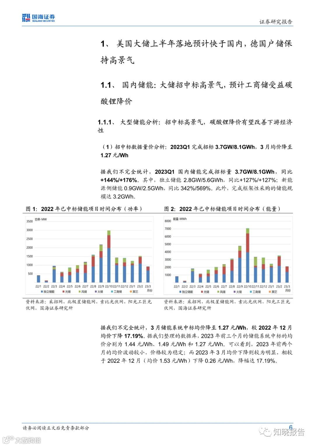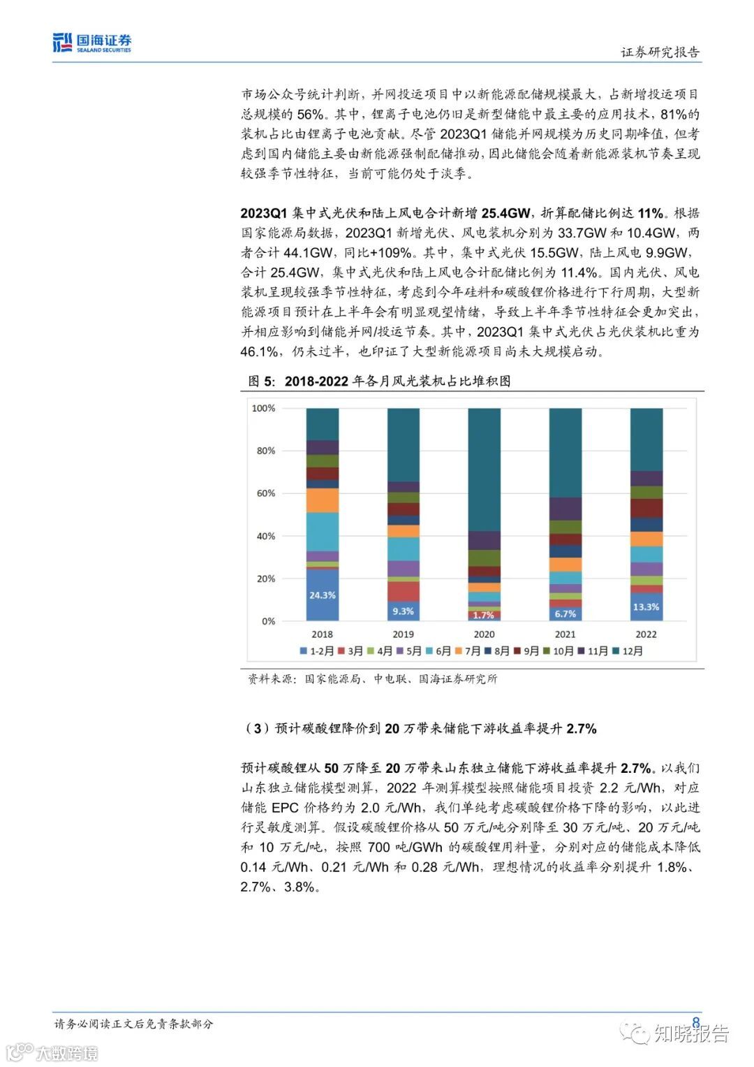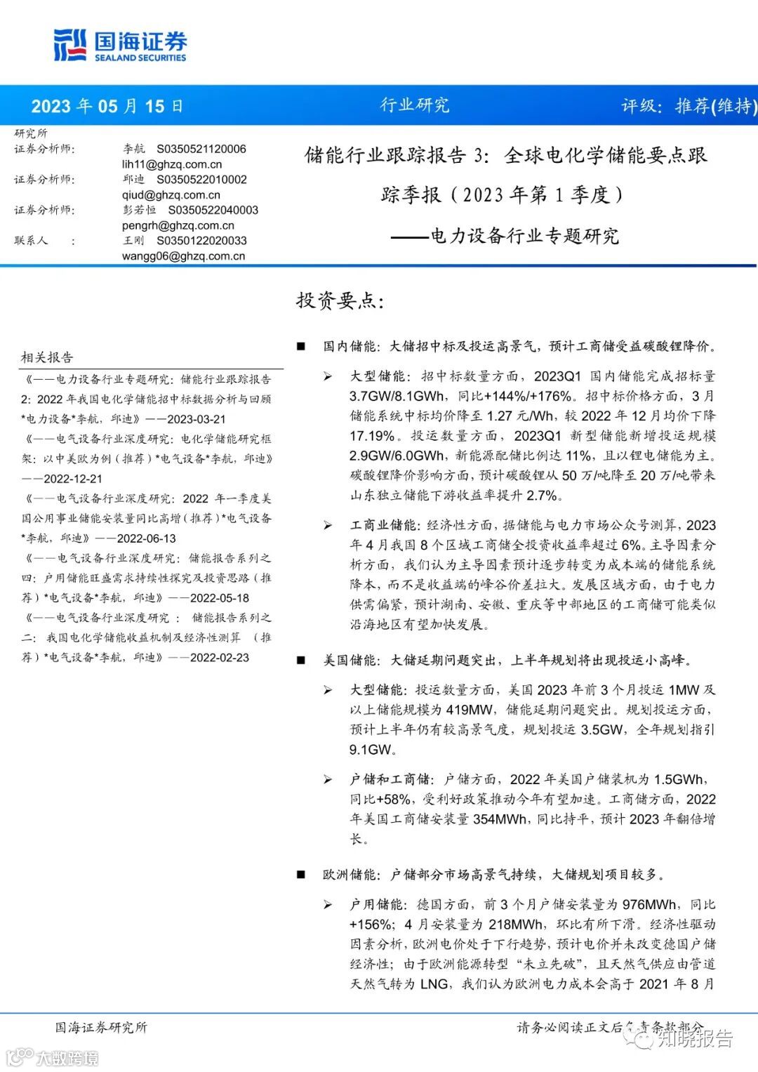 大型储能:招中标数量方面,2023Q1国内储能完成招标量3.7GW/8.1GWh,同比+144%/+176%。招中标价格方面,3月储能系统中标均价降至1.27元/Wh,较2022年12月均价下降17.19%。投运数量方面,2023Q1新型储能新增投运规模2.9GW/6.0GWh,新能源配储比例达11%,且以锂电储能为主。碳酸锂降价影响方面,预计碳酸锂从50万/吨降至20万/吨带来山东独立储能下游收益率提升2.7%。