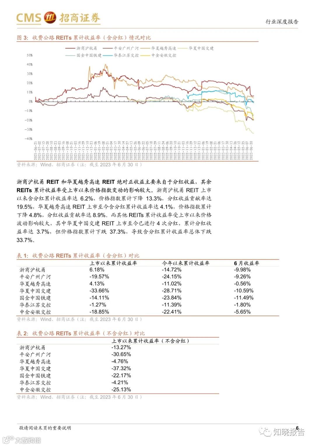 REITs二级市场受部分资产基本面预期转弱及交易活跃度低等因素影响表现持续低迷。回顾市场历史变化情况,2022年9月至今公募REITs市场受交易活跃度减弱等因素影响持续震荡下行,其中收费公路REITs整体绝对收益情况受市场影响也表现不佳,当前仅浙商沪杭甬REIT和华夏越秀REIT取得绝对正收益,主要由于分红收益贡献率较高。
