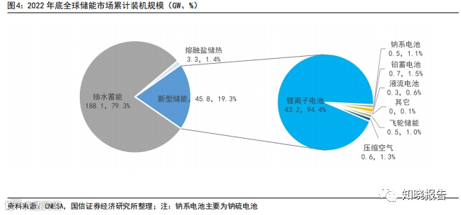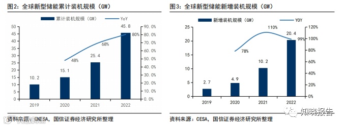 新型储能近年来呈现高速发展态势,根据 CNESA 数据,2022 年全球新型储能累计装机量达到 45.8GW,同比增长超 80%;新增新型 储能装机量为 20.4GW,同比增长超 99%。