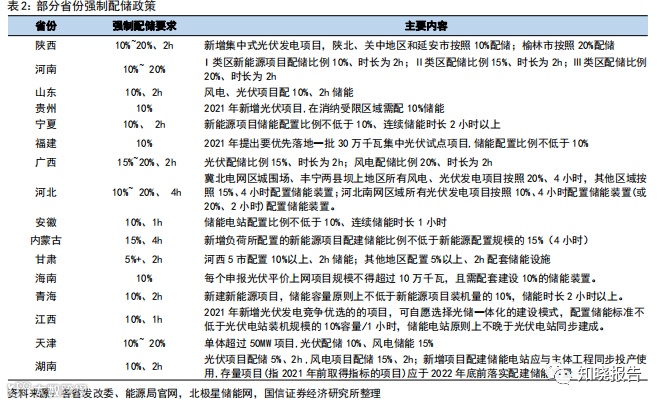 2021 年以来,国家在储能政策上持续加码。2021 年 8 月发改委、能源局发布《关 于鼓励可再生能源发电企业自建或购买调峰能力增加并网规模的通知》,鼓励发 电企业自建储能或调峰能力增加并网规模,超过电网企业保障性并网以外的规模 初期按照功率 15%的挂钩比例(时长 4 小时以上)配建调峰能力,按照 20%以上挂 钩比例进行配建的优先并网,国家强制配储政策正式推出。随后各地方政府分别 推出相应配储政策,国内表前储能市场进入快速发展期。