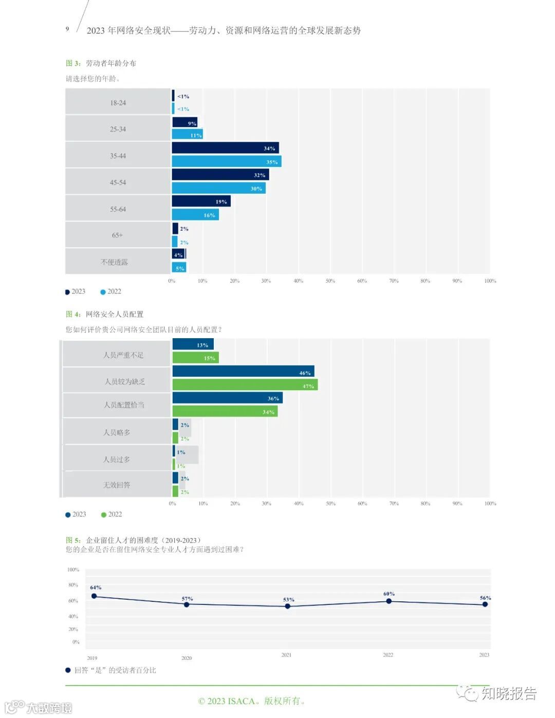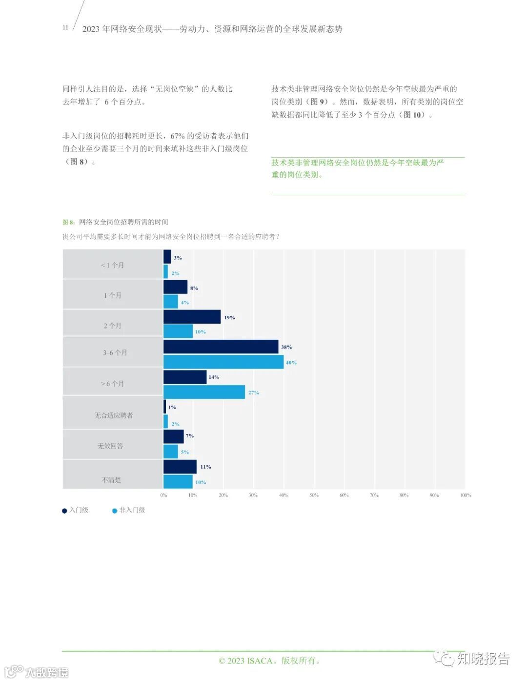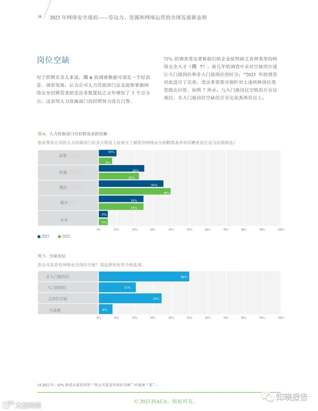 在负责安全管理工作的受访者中,工作经验不足三年的人数占比与往年数据持平。此外,受访者的人口统计信息表明,安全管理人员呈现出老龄化的趋势。71%的受访企业仍有空缺的网络安全岗位,其中空缺的高级岗位数量是入门级岗位的两倍。没有岗位空缺的受访企业数量增加了 6 个百分点。