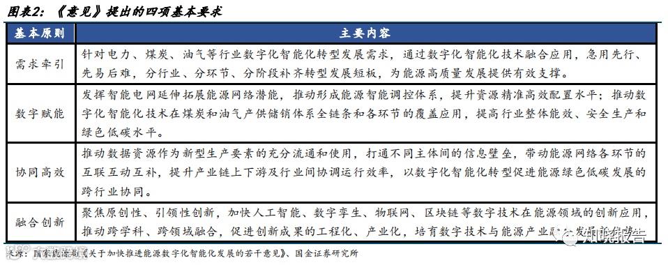 《意见》提出的四项基本要求包括需求牵引、数字赋能、协同高效、融合创新。推动数字 化智能化技术与能源产业发展深度融合,加快人工智能、数字孪生、物联网、区块链等数 字技术在能源领域的创新应用,最终为构建清洁低碳、安全高效的能源体系,为积极稳妥 推进碳达峰碳中和提供有力支撑。