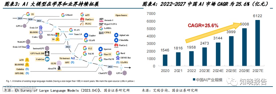 AI 应用已从消费、互联网等泛 C 端领域,向 B 端传统 行业辐射,AI 大模型在基础层、技术层、应用层均持续突破,AI 正加速赋能千行百业。22 年市场规模近 2000 亿元,2022-2027 年 CAGR 为 25.6%。据艾瑞咨询数据,2022 年中国 AI 产业规模达 1958 亿元,年增长率 7.8%。2022 年业务增长主要依靠:1)智算中心建设 及大模型训练等应用拉动需求的 AI 芯片市场、2)智能机器人及对话式 AI 市场。