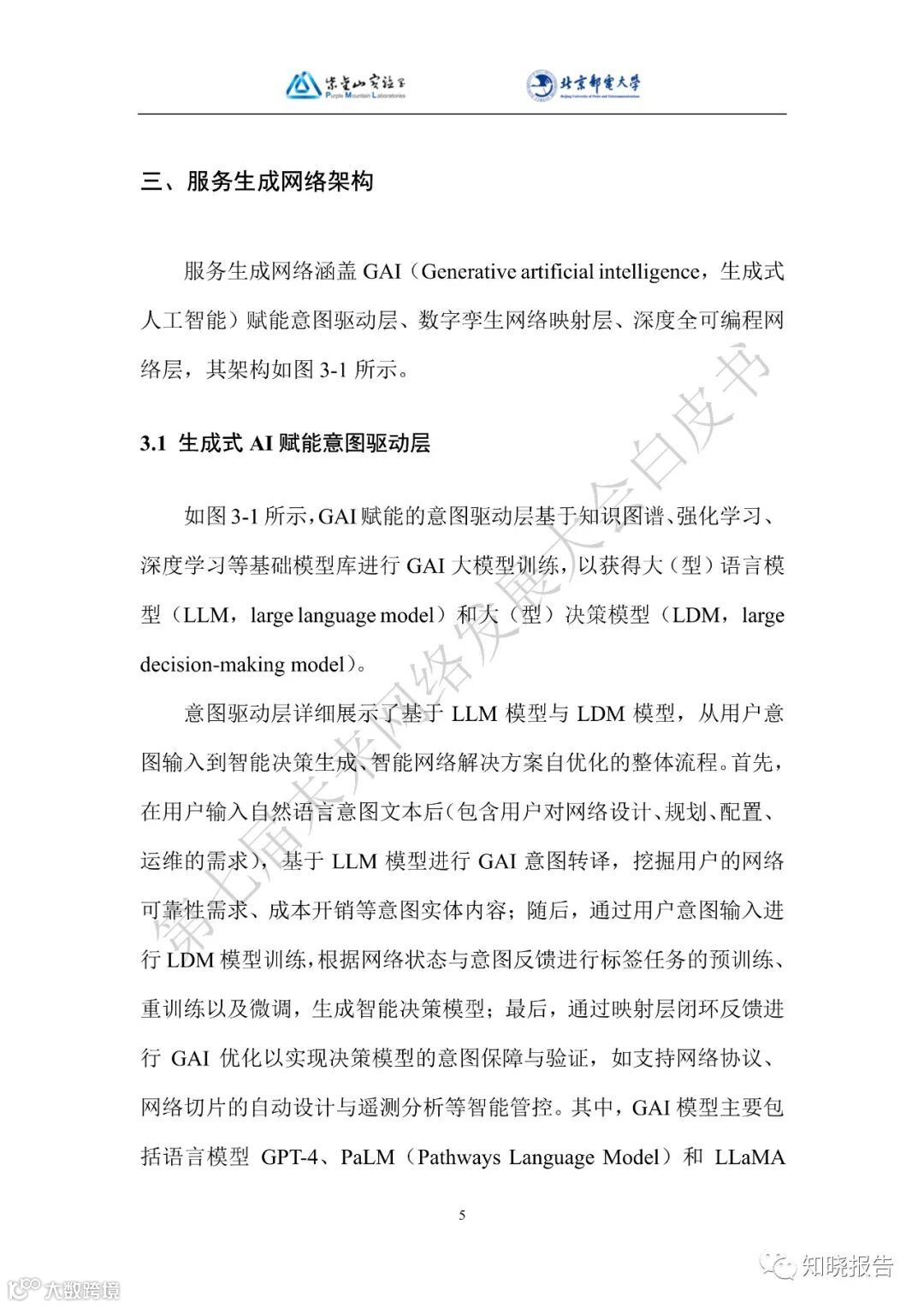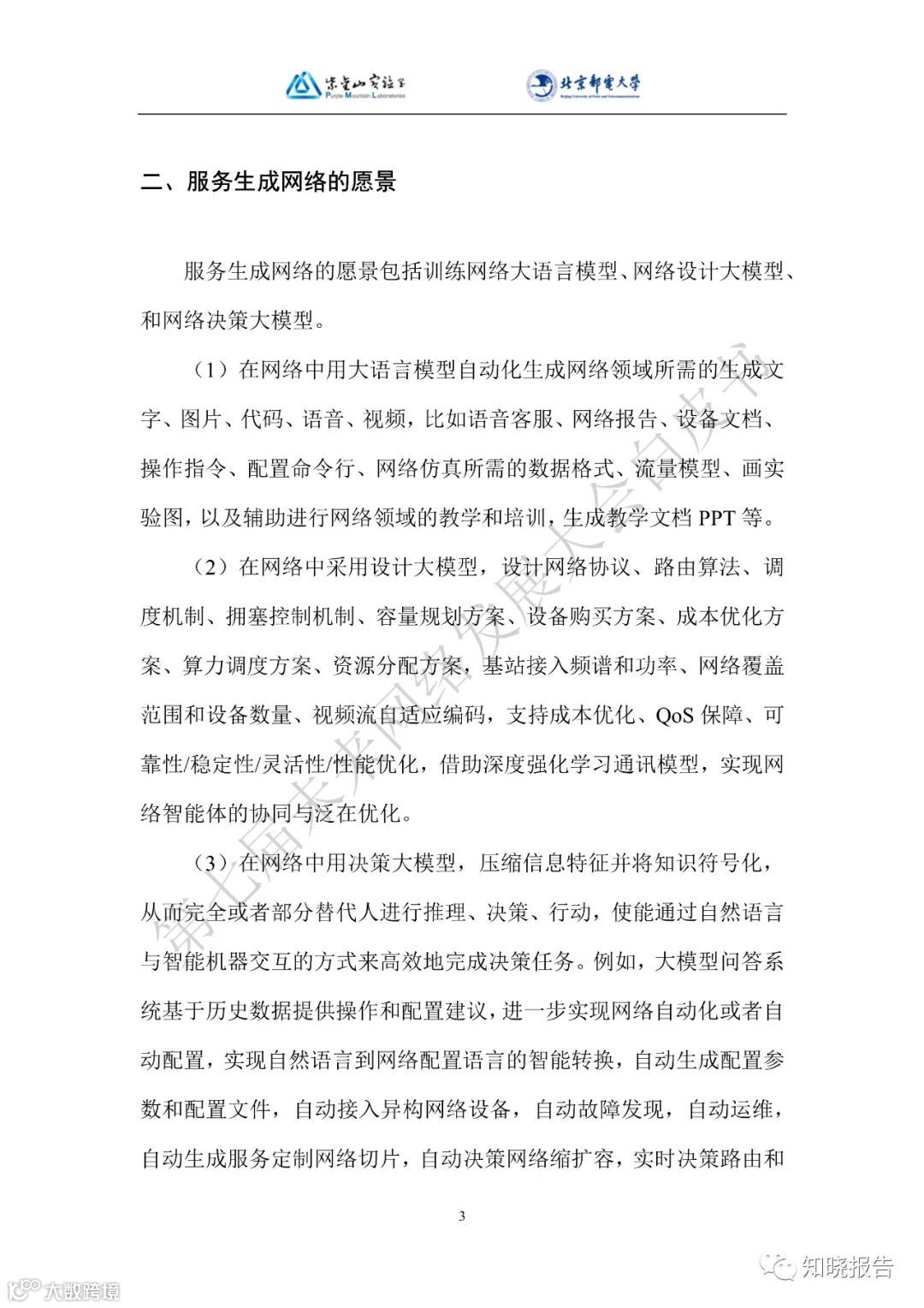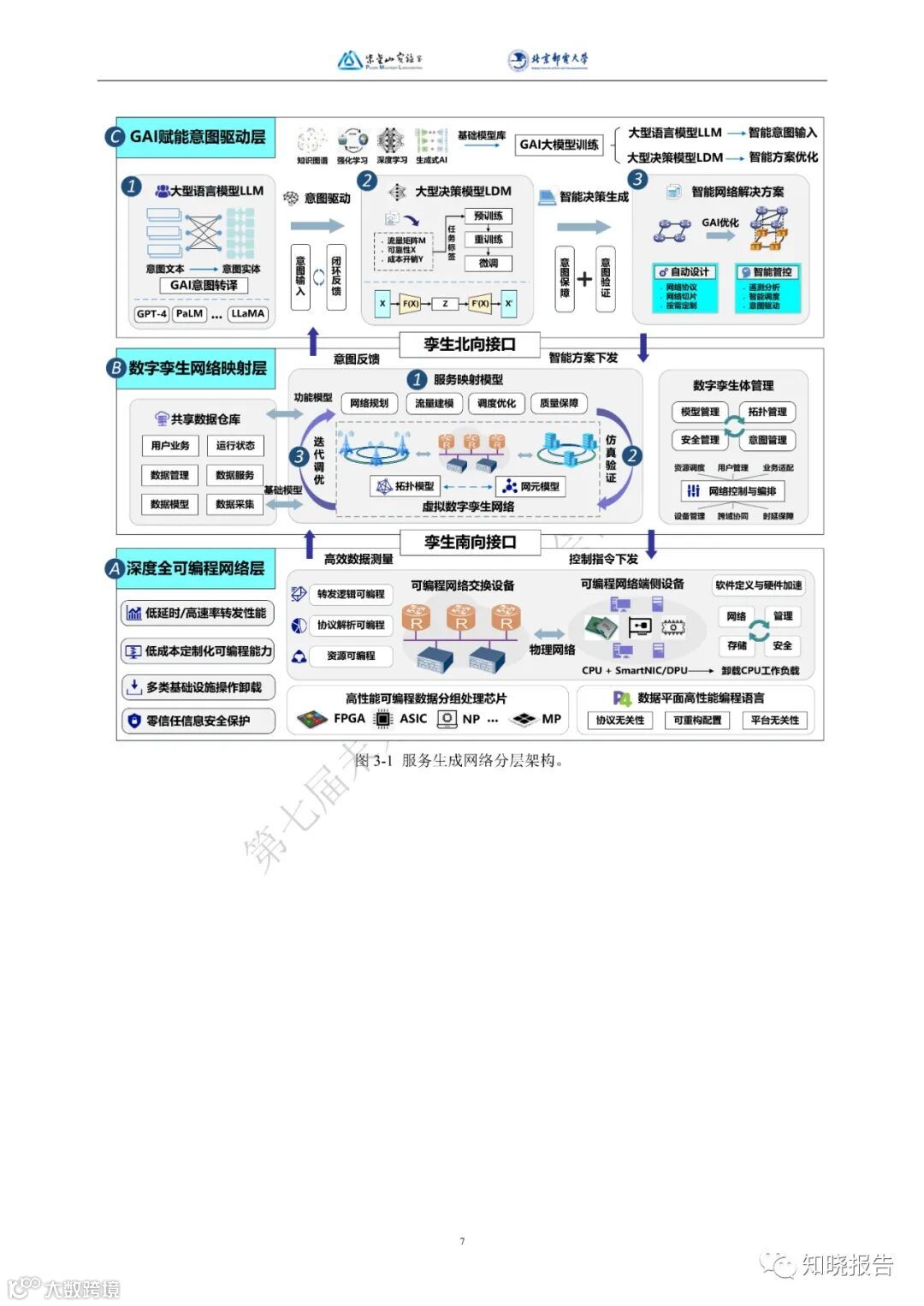 在网络中采用设计大模型,设计网络协议、路由算法、调度机制、拥塞控制机制、容量规划方案、设备购买方案、成本优化方案、算力调度方案、资源分配方案,基站接入频谱和功率、网络覆盖范围和设备数量、视频流自适应编码,支持成本优化、QoS 保障、可靠性/稳定性/灵活性/性能优化,借助深度强化学习通讯模型,实现网络智能体的协同与泛在优化。