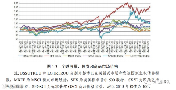 国际金融市场有所回稳,但不确定性和避险情绪依然存在。从全球 股市看,上半年总体呈波动上涨态势。2023 年 6 月末,美国标普 500 指数和欧元区斯托克 50 指数均较 2022 年末上涨 16%,新兴市场股票指 数(MSCI)上涨 3.5%。其中,受硅谷银行等风险事件冲击,3 月上中 旬美国标普 500 指数和道琼斯指数均出现短期下挫,美国的银行业股票 市值曾蒸发超千亿美元,欧元区、英国等股市也受到相关事件波及呈现 阶段性下跌。从债市看,受主要发达经济体持续加息等因素影响,全球 债券市场表现逊于股市,上半年彭博巴克莱新兴市场和发达国家主权债 券指数较 2022 年末分别增长 3.9%和 0.6%。大宗商品价格高位回落,6 月末标准普尔 GSCI 商品价格指数较 2022 年末下降 11%,仍高于疫情 前水平(见图 1-3)。总体看,全球金融市场仍面临实体经济增长放缓、 货币政策不确定性上升、全球流动性持续收紧、地缘政治冲突升级等潜 在风险。