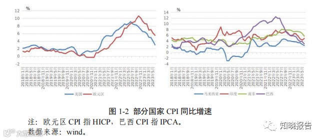 美欧通胀高位回落但短期难回疫情前水平,新兴经济体通胀大多下降。2023 年 6 月,美国消费者价格指数(CPI)同比上涨 3.0%,连续 12 个月下行;欧元区调和消费者价格指数(HICP)同比上涨 5.5%,较 年初 9%的涨幅明显回落,欧美通胀仍高于疫情前 2%左右的水平。新兴 经济体方面,6 月,南非、印度、马来西亚 CPI 和巴西广义消费物价指 数(IPCA)同比分别上涨 5.7%、4.9%、2.4%和 3.2%,均较 2022 年末 同比涨幅明显下降;但土耳其和阿根廷 CPI 同比分别上升 38%和 117%, 仍处于较高水平。