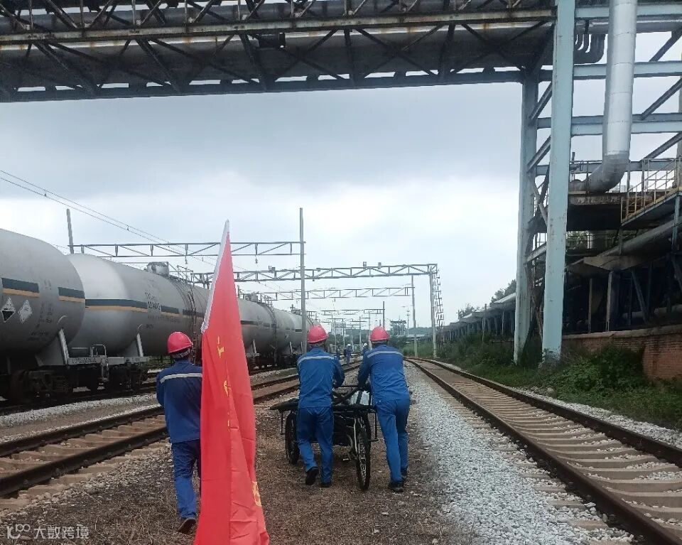 仓储党支部党员突击队挺身而出负责运输胶皮管线,他们顶着33℃高温,用自行车、手推车载着胶管,在没有路的铁轨边艰难前行,汗水湿透了工装。