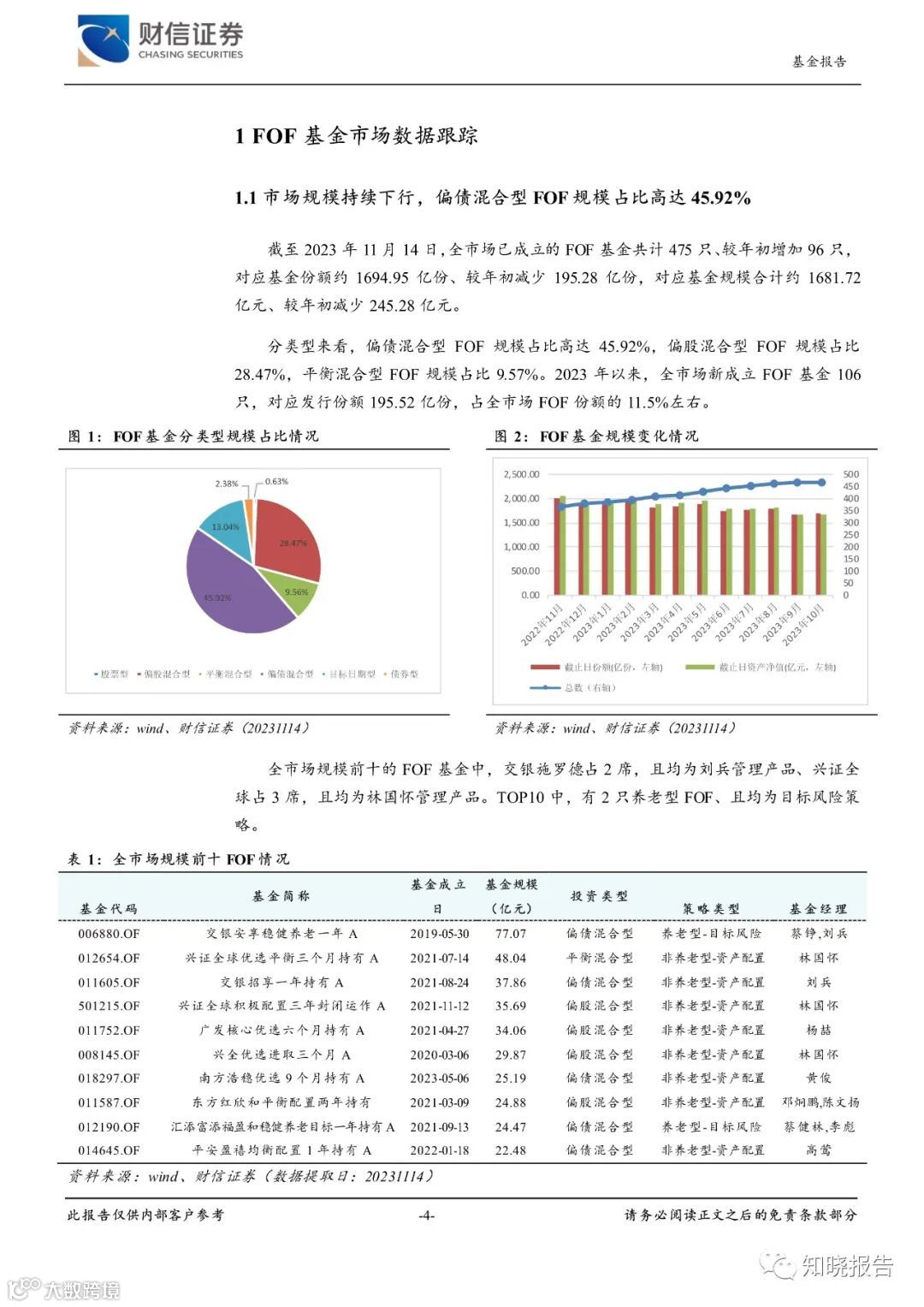 截至 2023 年 11 月 14 日,全市场已成立的 FOF 基金共计 475 只、较年初增加 96 只,对应基金份额约 1694.95 亿份、较年初减少 195.28 亿份,对应基金规模合计约 1681.72亿元、较年初减少 245.28 亿元。
