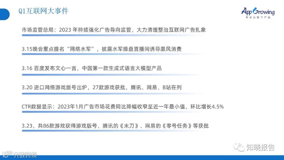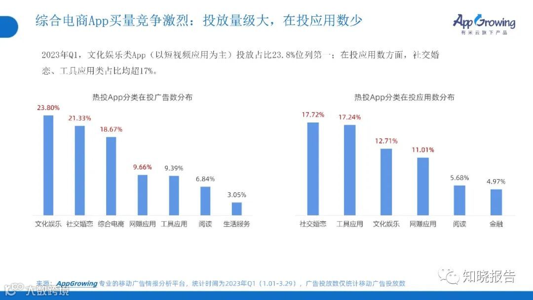 2023年Q1,文化娱乐类App(以短视频应用为主)投放占比23.8%位列第一;在投应用数方面,社交婚恋、工具应用类占比均超17%。