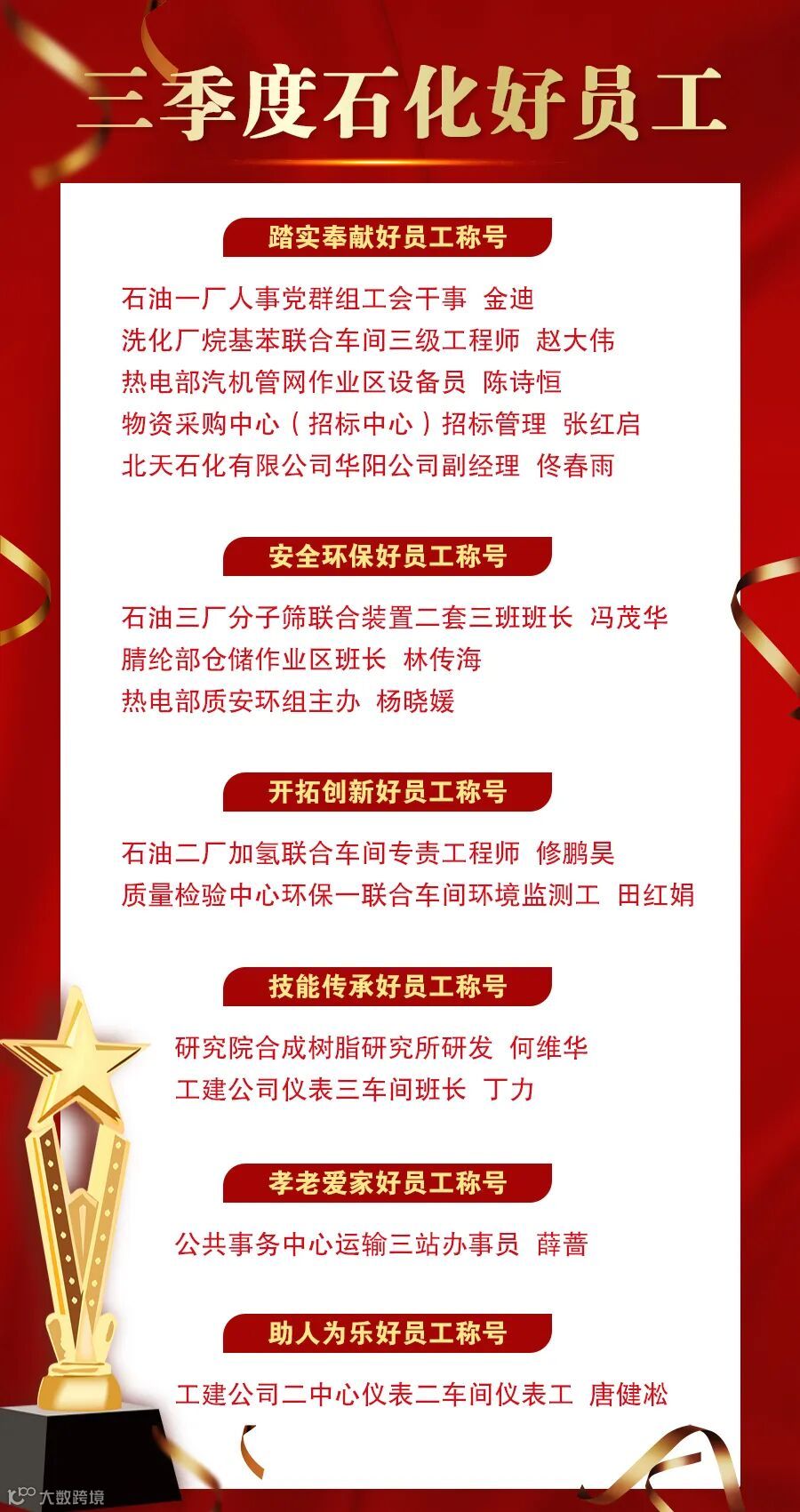 本季获得踏实奉献好员工称号的是石油一厂人事党群组工会干事金迪、洗化厂烷基苯联合车间三级工程师 赵大伟、热电部汽机管网作业区设备员陈诗恒、物资采购中心(招标中心)招标管理张红启、北天石化有限公司华阳公司副经理佟春雨;获得安全环保好员工称号的是石油三厂分子筛联合装置二套三班班长冯茂华、腈纶部仓储作业区班长林传海、热电部质安环组主办杨晓媛;获得开拓创新好员工称号的是石油二厂加氢联合车间专责工程师修鹏昊、质量检验中心环保一联合车间环境监测工田红娟;获得技能传承好员工称号的是研究院合成树脂研究所研发何维华、工建公司仪表三车间班长丁力;获得孝老爱家好员工称号的是公共事务中心运输三站办事员薛蔷;获得助人为乐好员工称号的是工建公司二中心仪表二车间仪表工唐健凇。