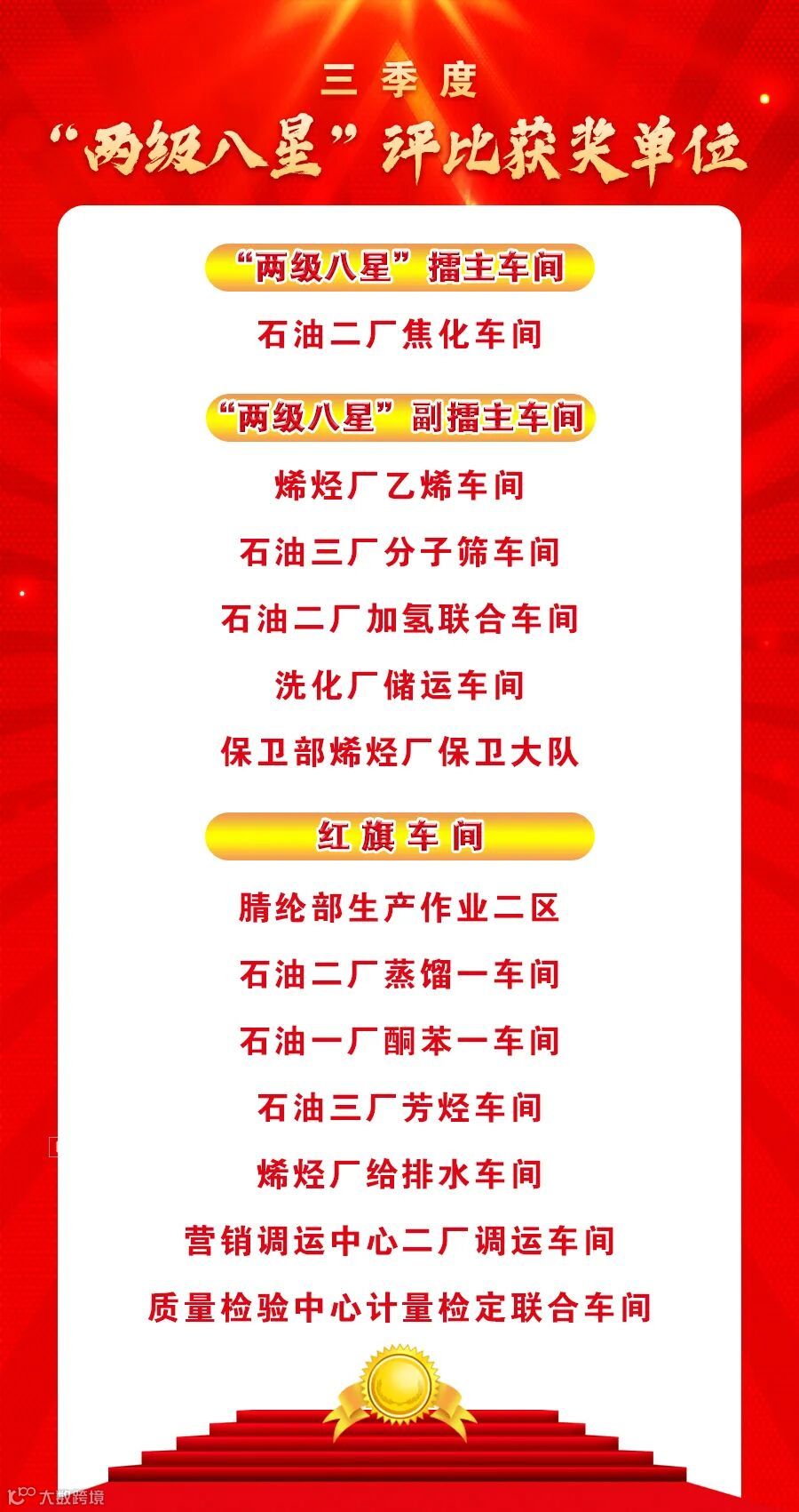 本季获得“两级八星”擂主车间的是石油二厂焦化车间;获得副擂主的是烯烃厂乙烯车间、石油三厂分子筛车间、石油二厂加氢联合车间、洗化厂储运车间、保卫部烯烃厂保卫大队;获得红旗车间的是腈纶部生产作业二区、石油二厂蒸馏一车间、石油一厂酮苯一车间、石油三厂芳烃车间、烯烃厂给排水车间、营销调运中心二厂调运车间、质量检验中心计量检定联合车间。