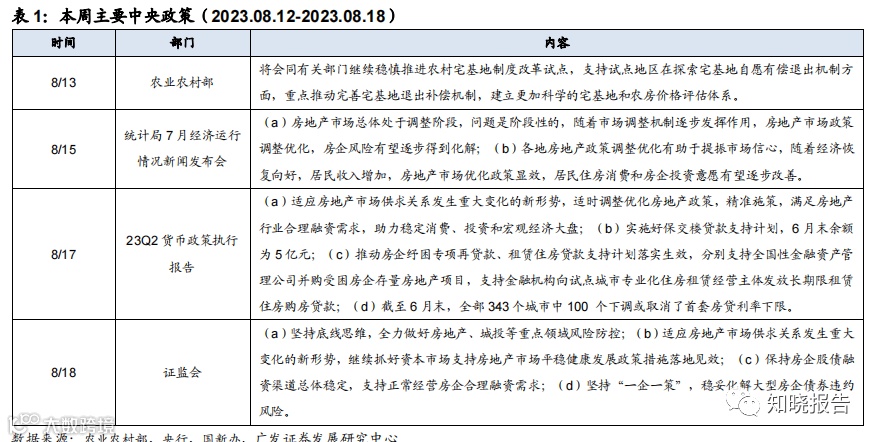 (一)主要政策回顾 中央政策方面,“化解房企风险”被多次提及。统计局7月经济运行情况新闻发布会指出,房地产市场总体处于调整阶段,问题 是阶段性的,随着市场调整机制逐步发挥作用,房地产市场政策调整优化,房企风 险有望逐步得到化解。