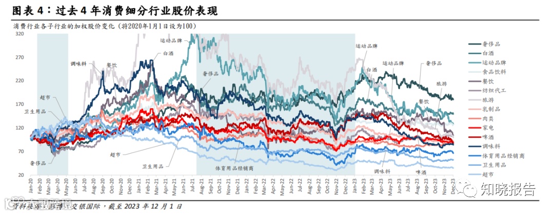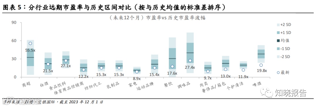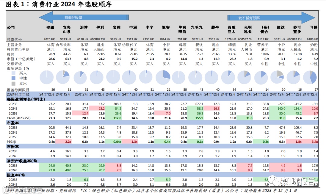 我们 2024 年对细分行业的偏好顺序是:国产体育品牌、食品饮料、体育用品 经销商、多品类乳制品生产商、纺服代工、啤酒、餐饮、个护家清、奶酪生产 商、婴儿配方奶粉。