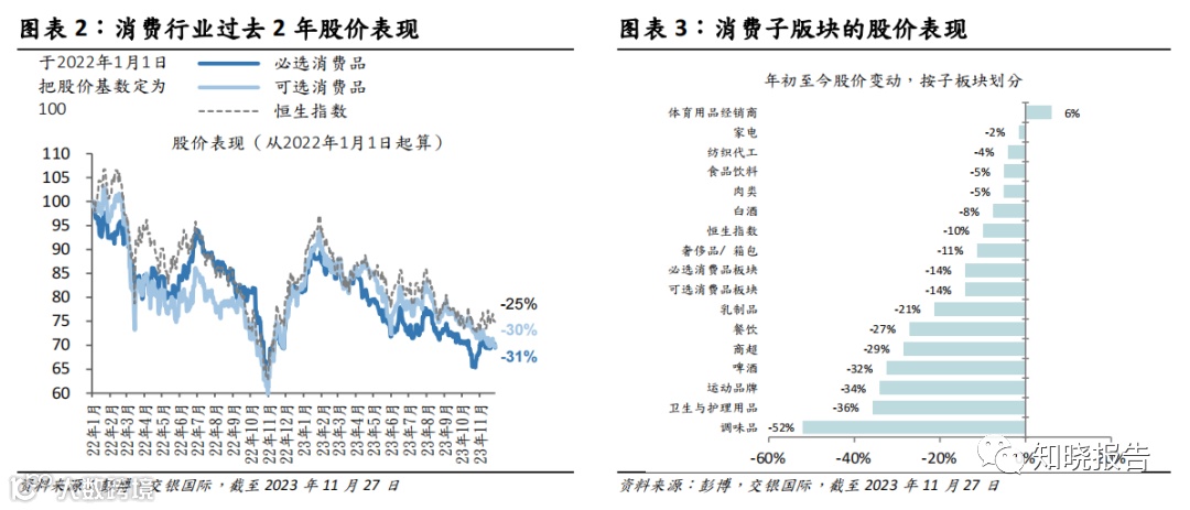 啤酒:预计 2024 年高端化将放缓;偏好华润啤酒多于百威亚太 啤酒行业是我们2023年1月份发布的全年展望中的行业首选,逻辑是出行与客 流的复苏对具社交属性的消费板块特别有利,而我们当时挑选华润啤酒为行业 首选,在之后的三个月内股价领先行业大涨 8%(对比恒指下跌 5%、消费板块 下跌 4%,截至 4 月 6 日)。但啤酒板块 4 月中开始失去势能,我们也在 6 月 5 日发布的 2023 年下半年展望中果断地下调了对啤酒行业的偏好排序,因为看 到消费情绪转趋保守,而那次选股也被验证,啤酒行业从报告发布到 11 月 27 日下跌25%,在14个消费细分板块中表现排名最后,大幅跑输必选消费行业平 均下跌 5%及恒指下跌 8%。