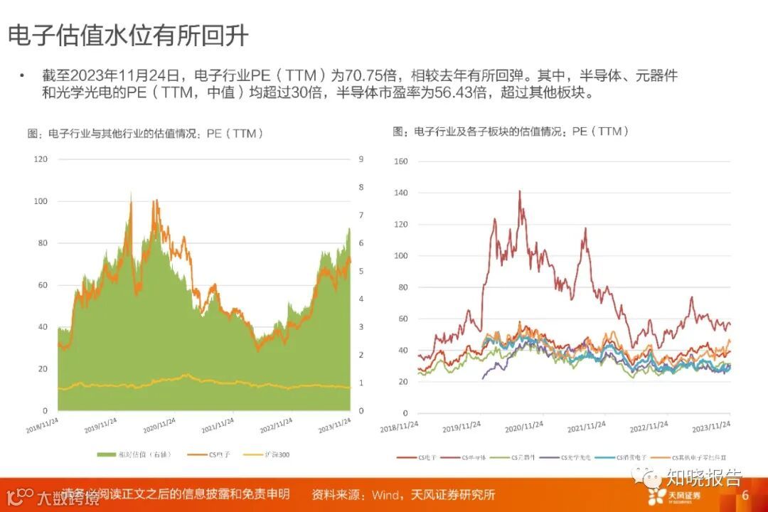 截至2023年11月24日,电子行业PE(TTM)为70.75倍,相较去年有所回弹。其中,半导体、元器件和光学光电的PE(TTM,中值)均超过30倍,半导体市盈率为56.43倍,超过其他板块。