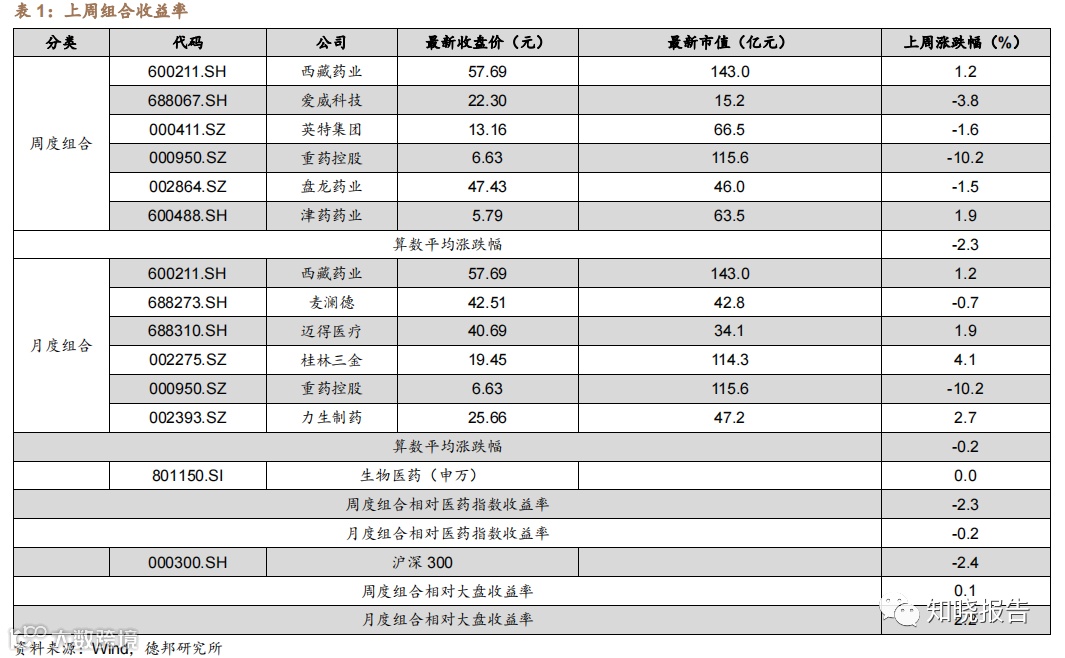 上周周度重点组合:算数平均后跑输医药指数 2.3 个点,跑赢大盘指数 0.1 个 点。上周月度重点组合:算术平均后跑输医药指数 0.2 个点,跑赢大盘指数 2.2 个 点。