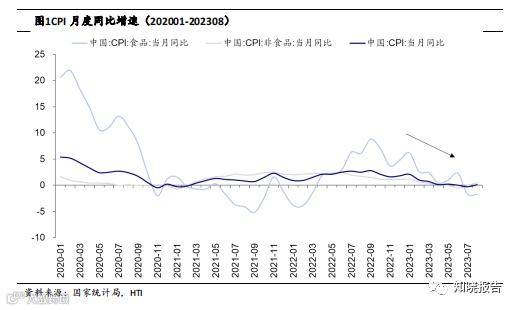 1H23 CPI 增速总体回落。1-6 月 CPI 同比增速分别为 2.1%、1.0%、0.7%、0.1%、0.2%、 0.0%,增速呈现收窄趋势,并于 7 月同比降低 0.3%出现负增长,8 月同比小幅增长 0.1%;6、7、8 月食品 CPI 分别同比增长 2.3%、降低 1.7%、降低 1.7%;6、7、8 月非食品 CPI 分别同比降低 0.6%、持平、增长 0.5%。总体来看,当下 CPI 增速在相对低点趋稳。