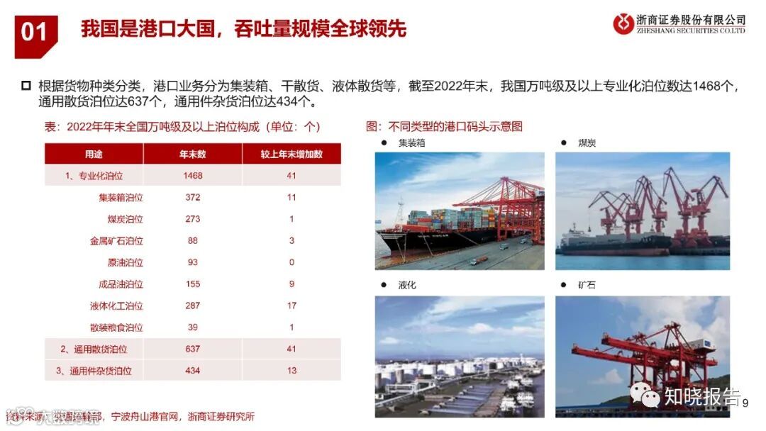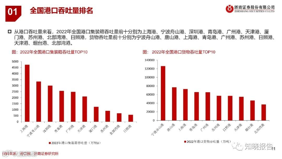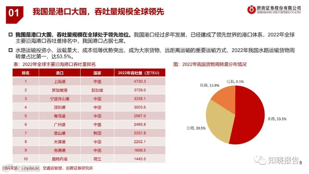 港口是资源配置的枢纽,我国港口吞吐量全球领先。港口是海上运输与陆上运输的连接枢纽,是货物中转、换装和集散的场地,为集装箱、干散货、液体散货客户提供运输中转、装卸搬运、仓储、堆场、配送等服务,我国港口经过多年发展,已经建成了领先世界的港口体系。