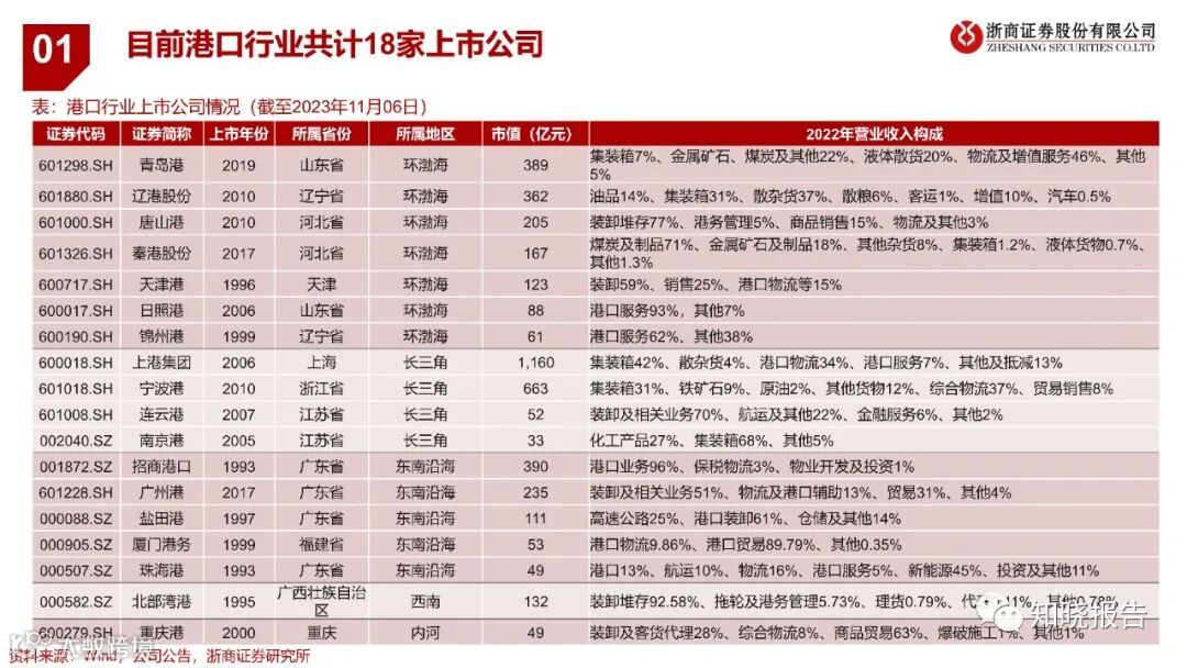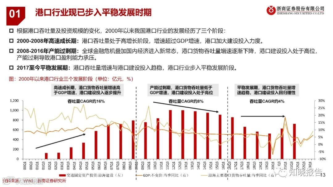 2022年全球主要沿海港口吞吐量排名中,我国港口占据七席,目前我国沿海港口已形成环渤海、长江三角洲、东南沿海、珠江三角洲和西南沿海五个港口群体,共计18家上市公司。港口行业目前已经进入成熟期 。根据港口吞吐量及投资规模的变化,2000年以来我国港口行业的发展经历了三个阶段,2000至2008年高速成长期,2008至2016年产能过剩期,2017至今平稳发展期。