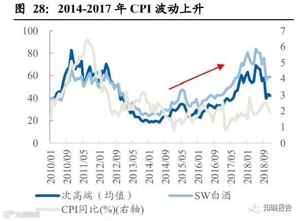 “四万亿”财政投资计划有效刺激经济复苏,大幅提振市场信心,政商务消费需求 重新升温,带动消费回暖。2008-2012 年年末白酒累计总产量由 569.33 万吨升至 1226.7 万吨,超前完成《中国酿酒产业“十二五”发展规划》中对 2015 年总产量达 960 万千升的目标要求,4 年产量增长率达 115.46%;由于“三公消费”仍处于快速 扩张阶段,在白酒消费中占比较高,对价格敏感度相对较低,从而为酒企直接提价 提供了便利,行业呈现量价齐升。在此周期中,次高端酒企逐步放量,持续提升品牌力,丰富产品结构,加强体系建设,全力开拓市场,满足政商务宴请各种层次需 求,在丰富酒企文化内涵,提升其品牌力和影响力,满足政商务消费需求层次,逐 步形成强支撑价格带。