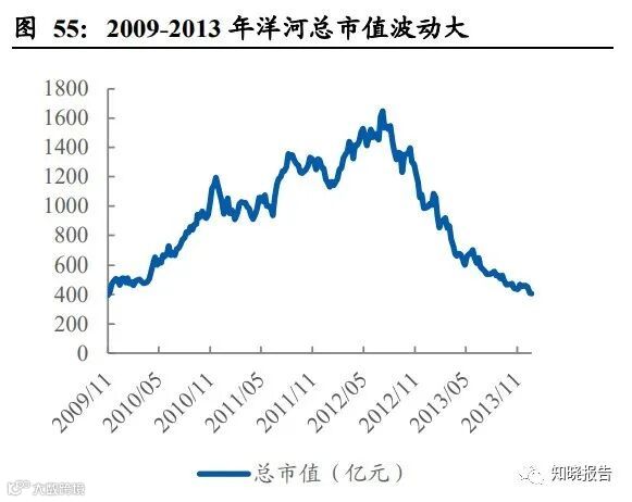 本周期洋河股价的上行驱动因素为全国化和高端化的战略。2009 年洋河股份公司提 出了全国化和高端化的战略,公司迅速发展,股价从不到 100 元一度升至 200 元以 上。洋河营业收入上升至 2012 年达到顶峰。洋河公司净资产收益率上升,在 2012 年达到最高点 49.16%,公司总资产净利率呈现波动下降趋势,在 2009 年为最高水 平 28.91%,在 2013 年达到最低水平 19.29%。